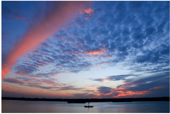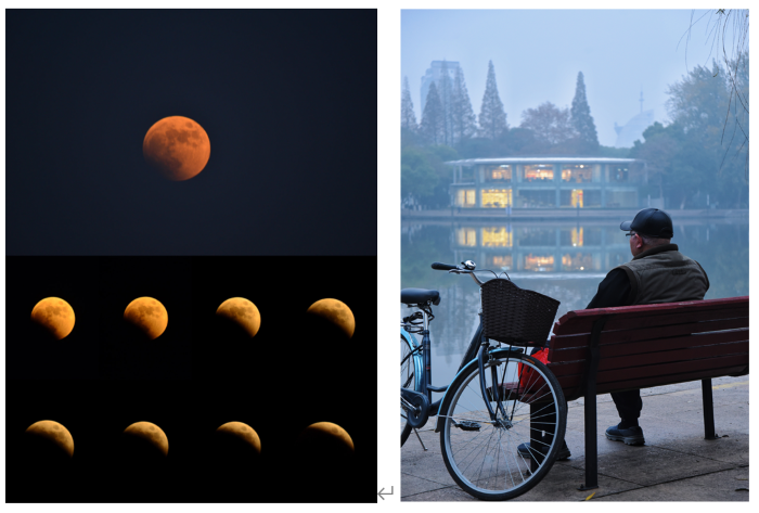 高福祥的《染》运用了色彩对比的手法,对天空的捕捉主要强调对暖调和冷调的对比,给画面增添了层次感;其次从整体来看,高福祥同学追求画面的点线面的和谐之感:天空和湖面组构成面,远方的树林呈现出一条直线而湖中的小帆船形似一点,三者完美结合使得画面十分工整和谐。朱政同学利用相机记录下一组《月食》,表达出如“人生代代无穷已,江月年年望相似”一般,任时光如何变迁,总有一轮明月孤居高天,阴晴圆缺,在深夜里填充着每一个在外游子心中的“亏”;