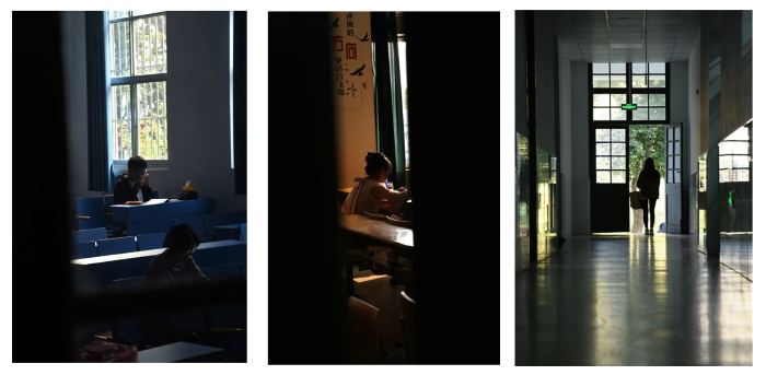 在纪实单元,以考研学子为记录对象,刘坊琳同学就作品《征途》的创作意图和结合运用的光影、构图形式与大家分享了她的创作心路。在这三张图中,每张图所展现的色调不尽相同,而为保持三张图的结构联系,刘坊琳采用都将人物主体放置画面中心的方法突出表现主题。