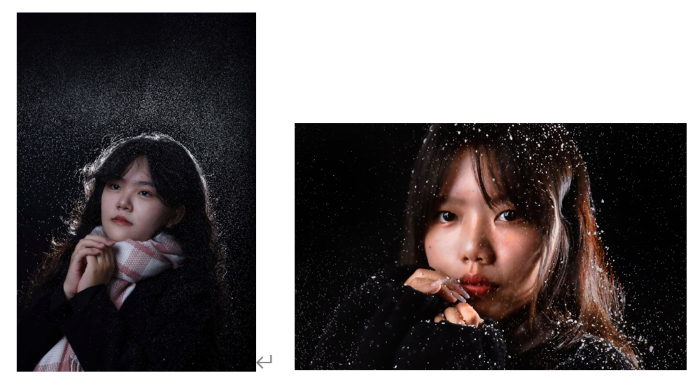 张妙妍、杨梦芹的作品结合棚内闪光效果拍摄了室内雪景人像。张妙妍指出«祈雪»的拍摄重点是在塑造出人物柔和肤质的前提下精确的控制闪光灯照亮人物面部,并将落雪与暗色背景分离开。相比强调半身人像作品展示的氛围感,杨梦芹在拍摄时着重于拍摄对象颜色、体态以及皮肤质感的刻画,通过在人物的左后方打上侧光来凸显人物的头发质感,整体用面部特写的方式对同一主题做出了迥然不同的刻画。