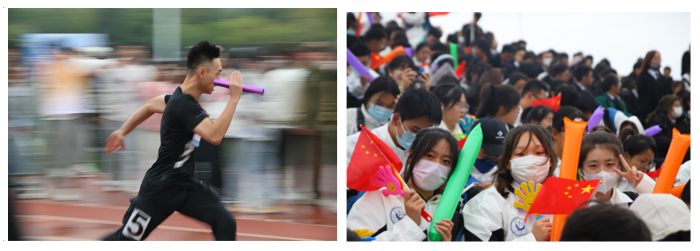 着眼于公司的运动会,朱政同学的作品《拼搏》运用了追随手法,以校运会上教科院男子接力为对象,利用虚化的背景、追随的拍摄方式凸显出手执接力棒的运动员,使画面充斥动感,矫健的身姿更体现了运动员的勇往直前、奋力拼搏。同时田坤鹏作品《飞扬》通过拍摄观众的表现来突出运动会现场的激烈,体现出青年老员工对体育的热爱与追求。