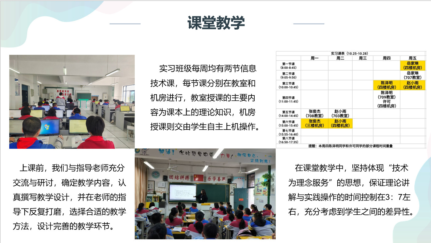 会议由班长汪梓然主持。会上,肖文老师首先对会议的召开目的进行了详细说明,其后8个实习小组结合PPT分别汇报了本组的实习情况。在为期12周的实习时间里,同学们奔赴芜湖市不同的中小学参与信息技术学科教学、班主任工作以及校园信息化建设、运动会、社团等丰富活动,有意识地开展教育调研,将所学理论知识应用于实践,充实地完成了教育实习任务,收获了宝贵的体验感悟。陈国倩、刘若彤、沈淑雯、岳家琳四位优秀实习生申请者则进一步对自身在实习过程中的做出的亮点工作进行了汇报,分享了自己对教育实习的总结与反思,为同学们提供学习进步的方向。
