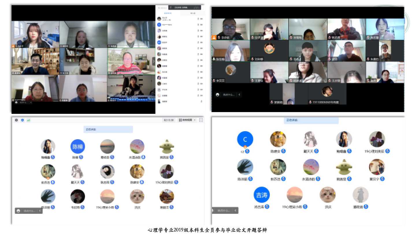本网讯(教科院 邓心宇)开题报告是提高毕业论文选题质量和水平的重要环节。为了帮助2019级心理学本科生更好地开展毕业论文相关工作,2023年1月10日下午2点心理学专业于腾讯会议线上平台开展了本科生论文开题答辩工作。答辩分成六组,共18位心理学专业老师参加了本次的开题指导会议,2019级心理学专业本科生全员参与。