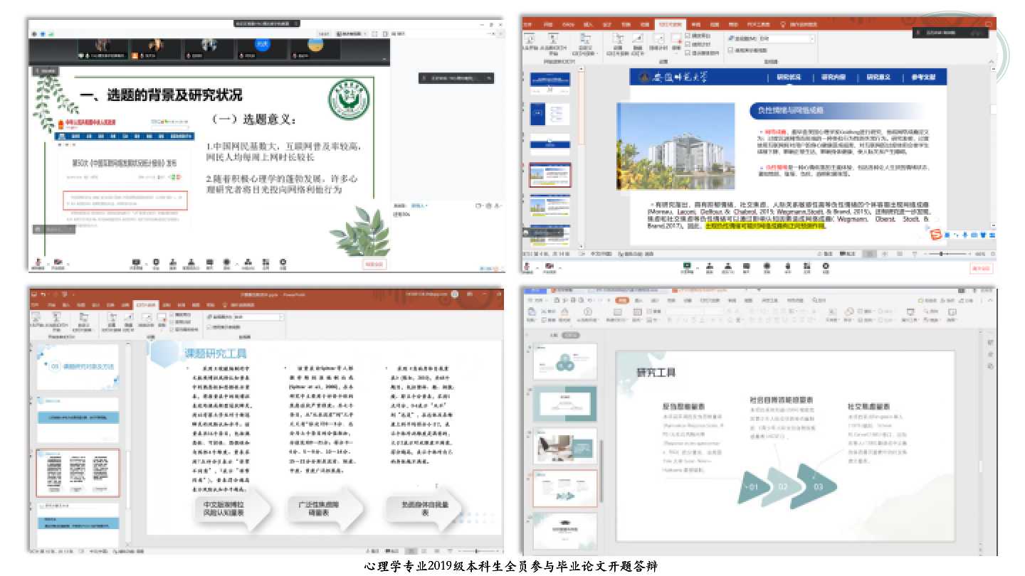 答辩活动于线上多个会议室同时进行,汇报正式开始前,组长全莉娟、王礼军、孙文强、彭苏浩、张冬梅、刘田田等老师在各组强调了本科生论文开题的价值与意义,希望同学们予以重视,并向同学们明确了开题的流程,提醒各位同序汇报时内容应有所侧重。接下来,同学们按照答辩顺序依次汇报自己的开题报告,采用口头叙述和ppt展示相结合的方式从选题的意义、研究现状、研究内容、研究方法和总体安排等多方面进行阐述。答辩小组老师认真倾听,严格把关,帮助员工明确研究思路及重点,并有针对性地从理论逻辑、实施难点、论文格式等多个方面提出了指导性意见,为员工毕业论文写作的顺利开题和高质量完成奠定了基础。开题指导会议结束后,2019级心理学本科生根据答辩老师的意见,与自己的指导老师及时沟通,进一步修改了开题报告,于1月14日全员完成开题报告的提交。