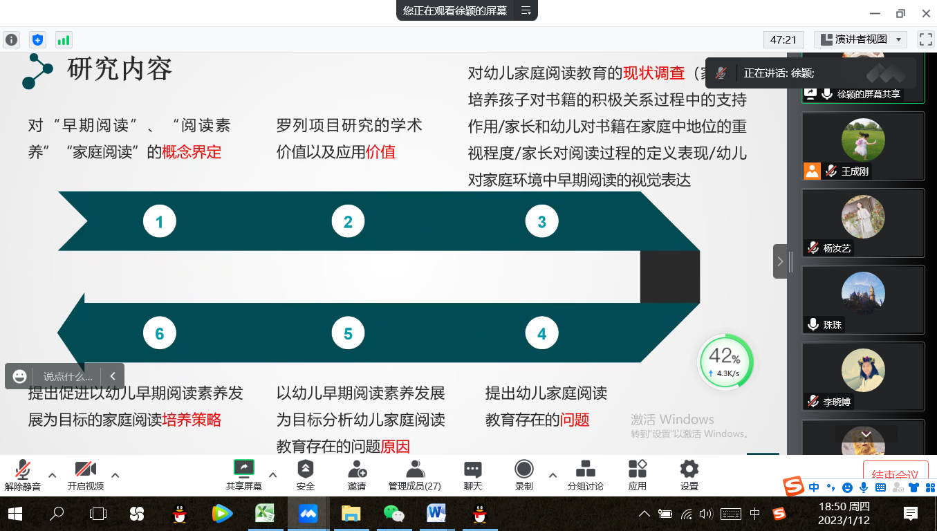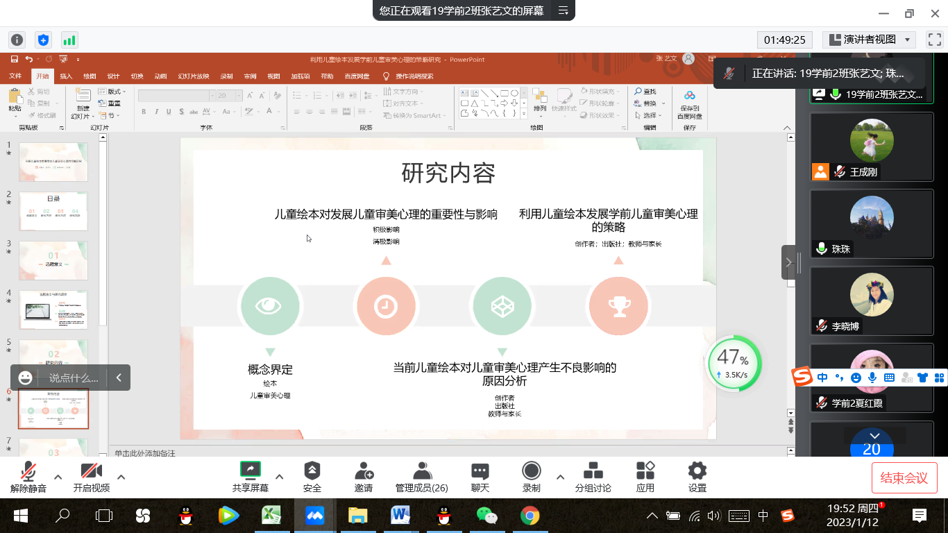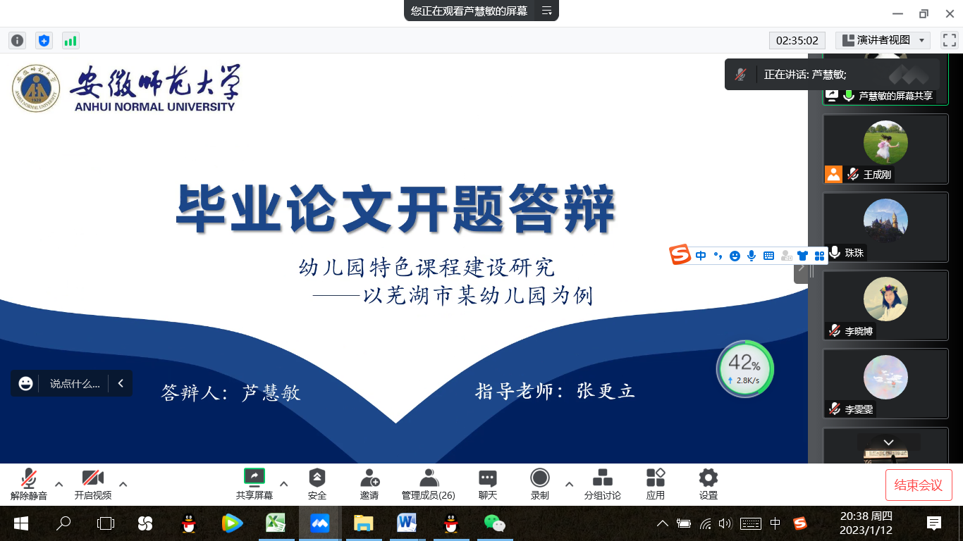 本网讯(教科院)切实做好2023届本科毕业论文(设计)撰写工作,保障本科生毕业论文质量,加强对毕业论文选题和撰写过程的指导与管理。2023年1月12日晚上,在腾讯会议线上举行2023届学前教育专业本科生毕业论文开题报告会。按照指导教师回避本人指导员工为基本原则,本次论文开题分五组进行,张更立、吴玲、孙德玉、赵学菊、朱立新担任五组的组长。参加报告会的还有指导教师张志华、刘婉、陈海燕、李毅恒、翟清华、王芬莲、葛燕、王萍、王成刚、李晓博等人以及2019级学前教育专业全体员工。