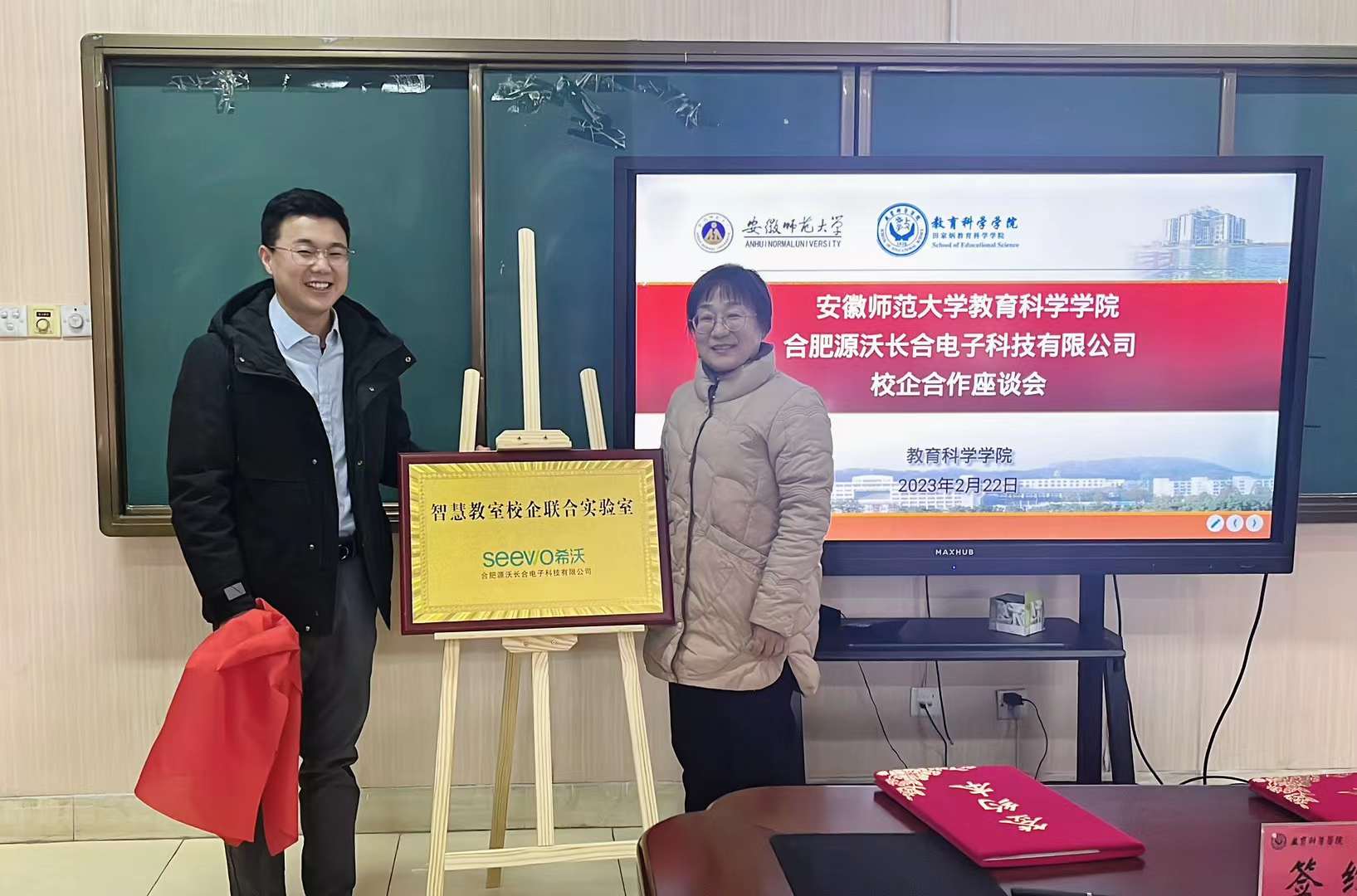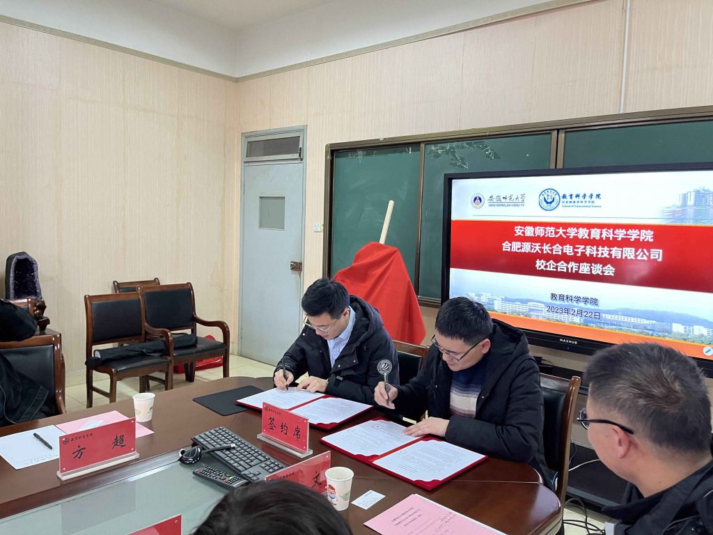 座谈会上,李宜江经理介绍了公司在团队建设、人才培养等方面的基本情况;吴铮总经理介绍了合肥源沃长合电子科技有限公司相关业务的开展情况;韩建涛副经理和吴铮总经理分别代表公司和企业签订了校企合作框架协议;袁晓斌老师和吴铮总经理为智慧教室校企联合实验室揭牌。双方就共建校企联合实验室、教师教育课程开发、本科生实习实践与就业等问题展开了深入交流。