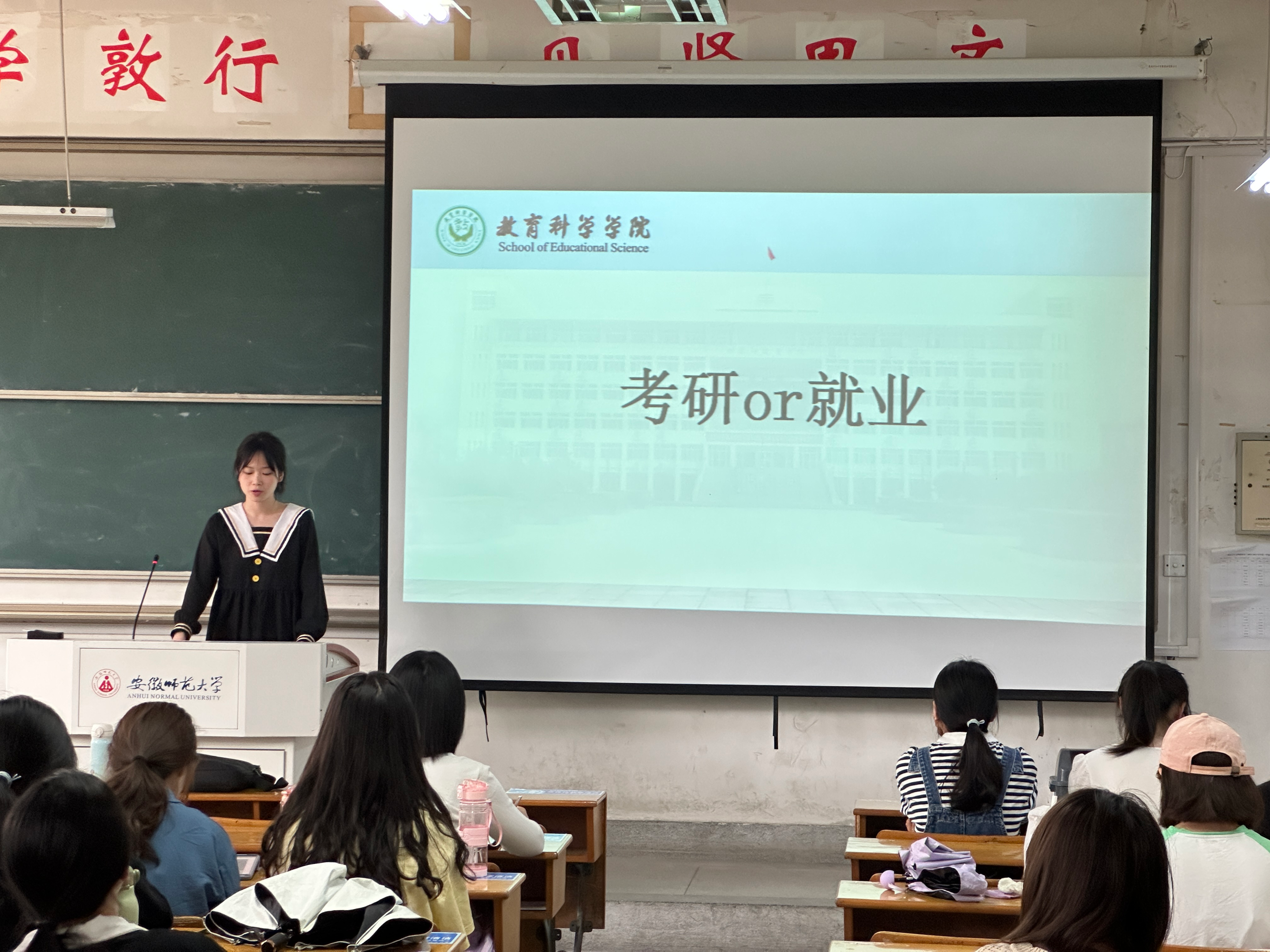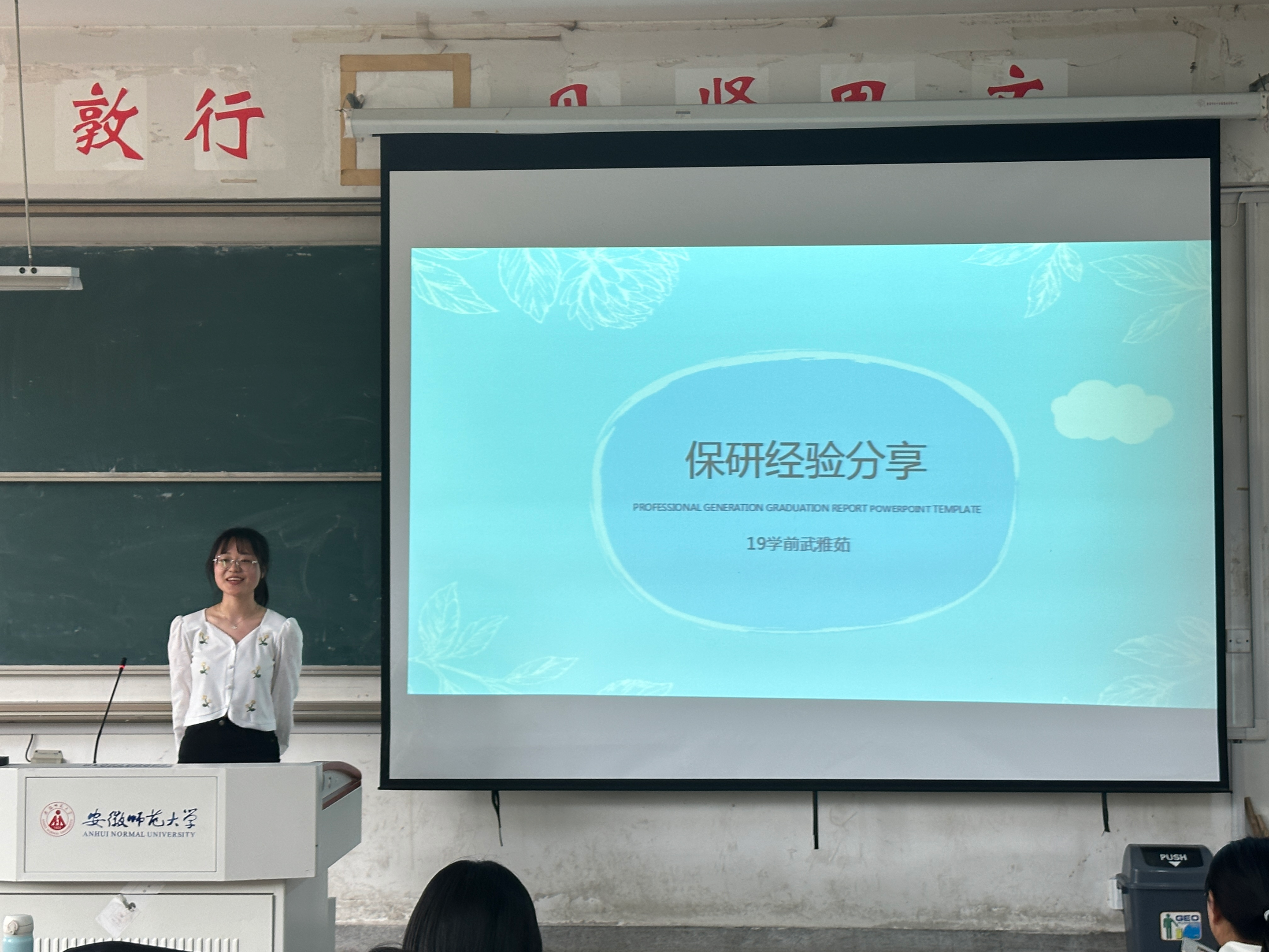 刘杨被江苏师范大学的教师教育学录取,她向大家分享了自己一志愿上岸失败的经验教训和调剂成功的建议。她总结到,考研时一定要做好规划总结,自己因为背书时候希望把每个知识点都背下来,在时间分配上没有合理规划。她表示,自己很感谢周围的一群优秀的好朋友和老师,正是老师的信任和同学们的鼓励与帮助才她有勇气走到今天。同时她也希望同学们现阶段不要盲目焦虑,她送给大家一句话“按部就班,就是伟大”。