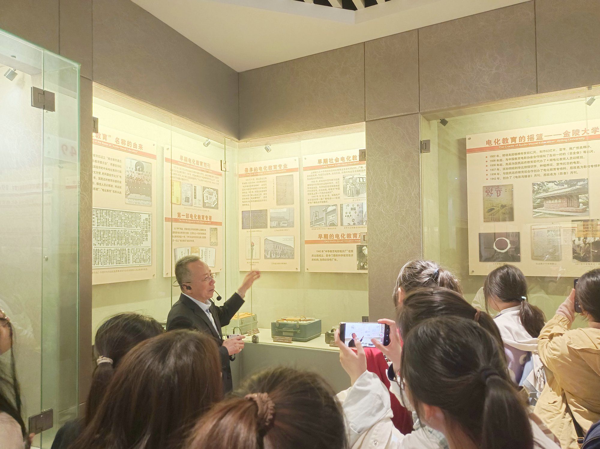 见习活动师生们第一站来到位于南通大学启秀校区的现代教育技术博物馆。在这里,馆长张小红向同学们讲解了我国教育技术的产生和发展历史,同学们一起欣赏了从民国时期至今的教育技术界前辈们的亲笔书信、文件原件、珍贵典籍和各类纪念品,了解了教育技术领域各个发展阶段的代表性技术装备。在张小红馆长的详细讲解下,同学们体会到教育技术学的重要作用、历史意义和发展历程的艰辛,并对其内涵有了更深刻的了解。