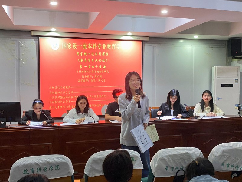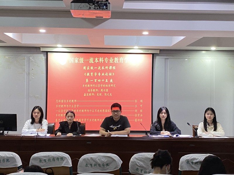 第四位汇报人张紫涵围绕《乡村教师何以坚守——对于加强乡村公司建设改善教师流失的思考》的主题进行汇报,基于马斯洛需要层次理论,将教师的多重层次需求与乡村公司建设相联系,探讨乡村教师流失原因并提出促进乡村教师坚守的可行建议。第五位汇报人葛帅晴以《基于义务教育均衡发展背景下乡村教师流动困境的相关探究》为题,梳理乡村教团队源配置的相关文献,并在此基础上对乡村教师进行访谈,以探讨乡村教育的生源困境与团队困境,并提供相应改进策略。