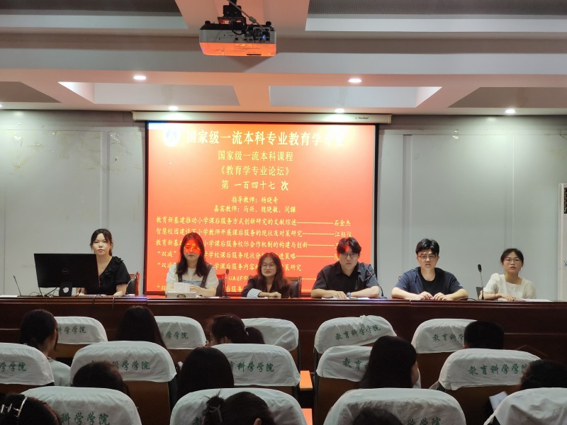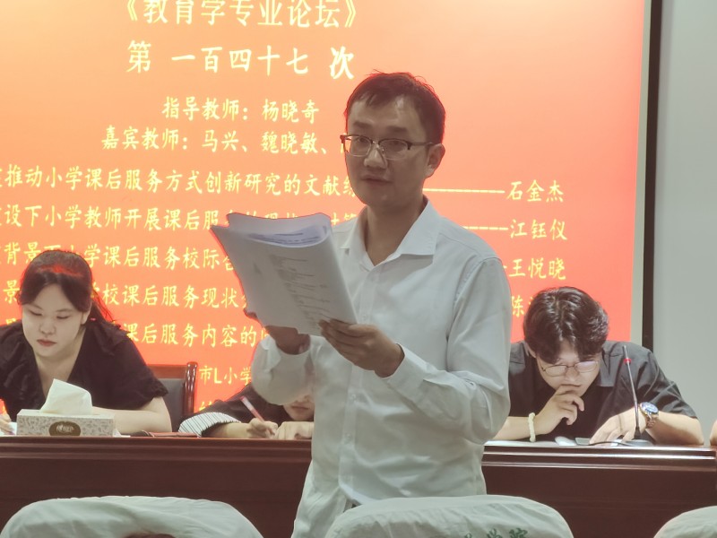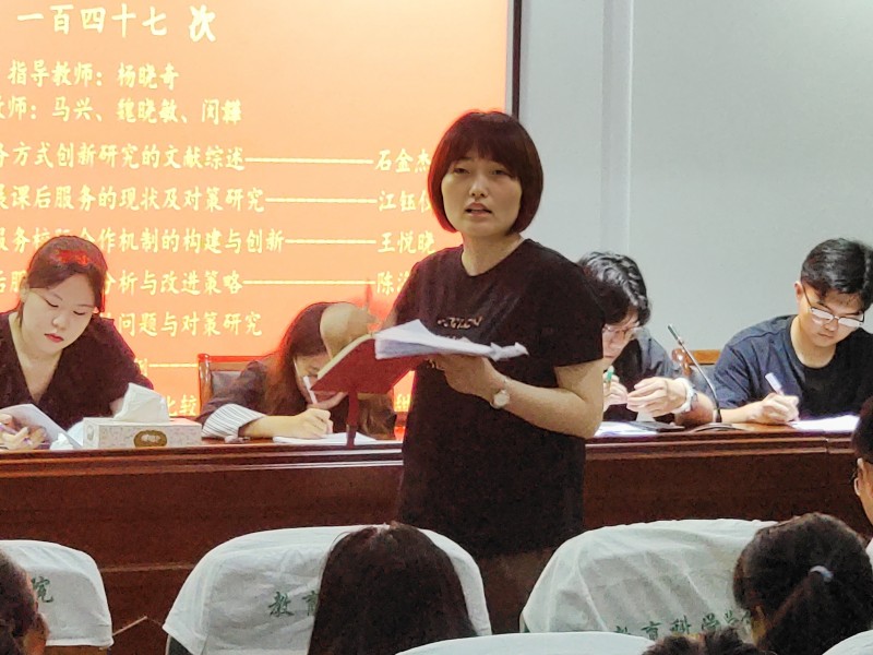 第四位汇报人陈海龙根据《“双减”背景下小学公司课后服务现状分析与改进策略》这一主题,借助问卷法和访谈法,探究小学公司课后服务现实状况,并从实施理念、实施机制和评价系统三个方面归纳小学课后服务现存问题并提供改进策略。第五位汇报人王琪森以《“双减”背景下乡村小学课后服务内容的问题与对策研究——以A省F市L小学为例》为题,以一所乡村小学为调查对象,分析乡村小学课后服务存在问题及产生原因,并提出针对性的解决对策。第六位汇报人王甜甜围绕《“双减”政策背景下小学课后服务的城乡差异比较研究》的主题进行汇报,综合运用问卷法、访谈法以及观察法调查两所城乡小学课后服务开展现状,并进一步分析城乡差异产生的原因,提出相应改进措施。