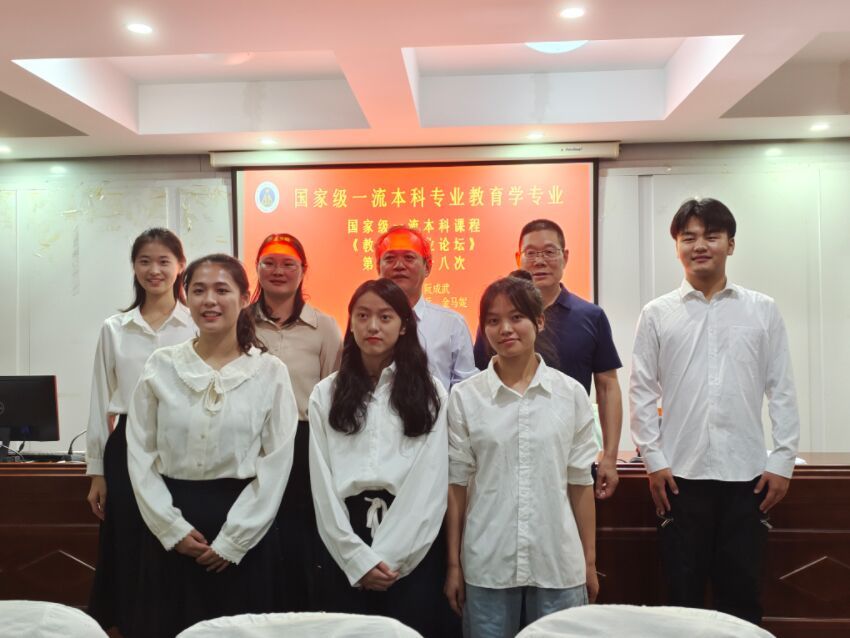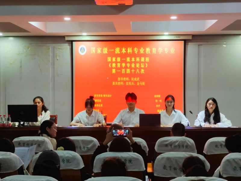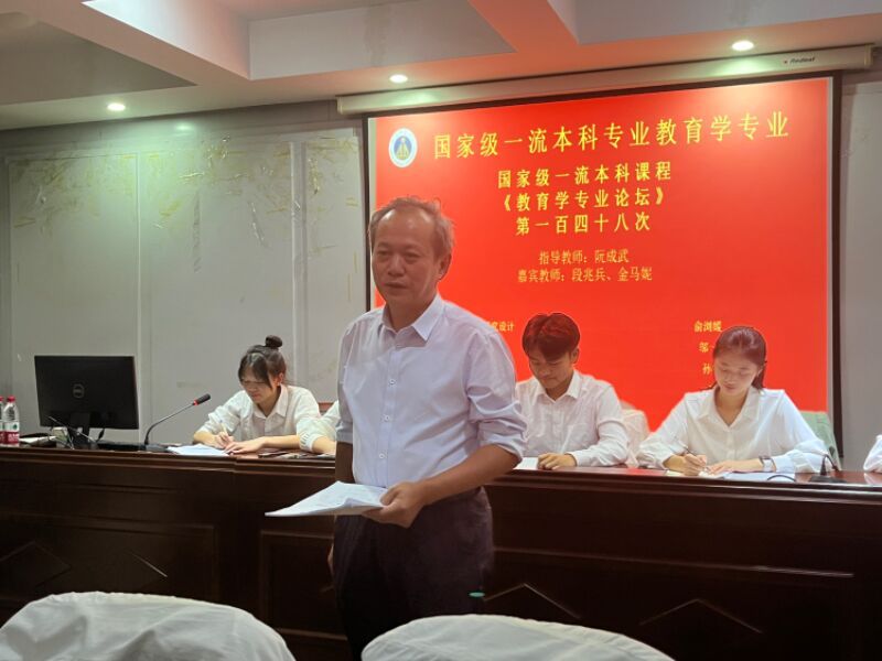 9月24日晚,国家级一流本科专业建设点教育学专业第一百四十八次专业论坛在公司三楼学术交流中心顺利举行。莅临本次专业论坛的有小组指导教师阮成武以及嘉宾教师段兆兵、金马妮,21级、22级教育学专业全体本科生到场参加,并由21级教育学咸欢欢担任主持人。