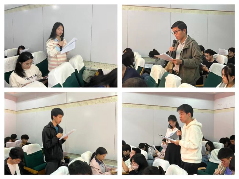 在集体讨论环节,同学们围绕本次专业论坛的主题进行提问。孙宇同学从家庭作业与书面作业之间的逻辑关系出发,建议左方倩将文题中的“书面家庭作业”修改为“家庭书面作业”。欧阳康杰同学就乔琳颖文献综述中“作业功能的历史演进”这一标题建议修改为“有关作业功能认识的历史演进”。汪文明同学认为潘梦雯在对策建议部分仅提到建立监督机制的重要性,缺少具体的实施策略。吴荣鑫同学指出曾佳钰的文章主体没有聚焦题目中的“现状研究”并且建议对策有些空洞笼统。汇报人针对这些问题或建议依次作出具体解答和回应,双方在一问一答中共同学习。