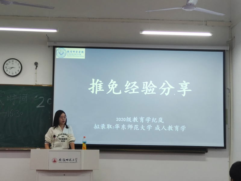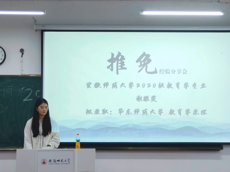 为帮助教育学专业同学进一步理解教育学学术人才的培养定位,更多投入到专业学习,为攻读研究生做好学业准备,教育学专业于10月11日晚在教学楼1302教室召开专业推免经验交流分享会。会议邀请到四位已成功推免的20级教育学专业员工。其中,谢雅雯推免至华东师范大学教育学原理方向,纪岚推免至华东师范大学成人教育学方向,石金杰推免至东北师范大学高等教育学方向,王悦晓推免至南京师范大学职业技术教育学方向。会议由21级教育学孙宇主持,21级、22级教育学专业部分员工参加。