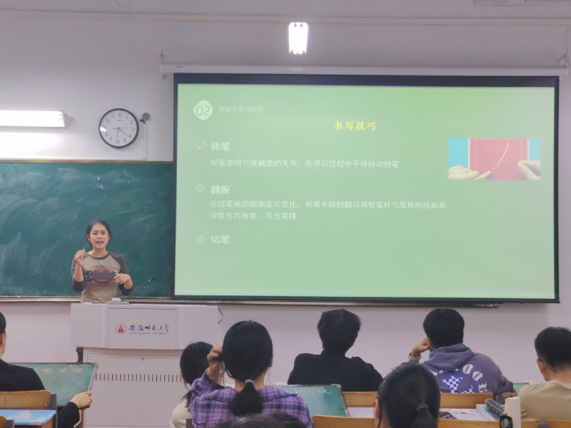随后,邬一鸣着重讲解粉笔字书写前的准备和书写时的技巧。她建议同学们在书写前打磨粉笔并正确握笔,以免出现粉笔折断的情况。在书写技巧方面,邬一鸣围绕粉笔字书写时转笔、翻腕和切笔三个步骤逐一展开介绍。其中,书写时应该不停转动粉笔,利用手腕的翻动调整方向和角度以写出笔锋、切笔时粉笔与黑板最好保持四十五度。此外,她用一条视频更加清晰直观地向同学们展示如何写好粉笔字,并以《春晓》为例进行板书讲解。
