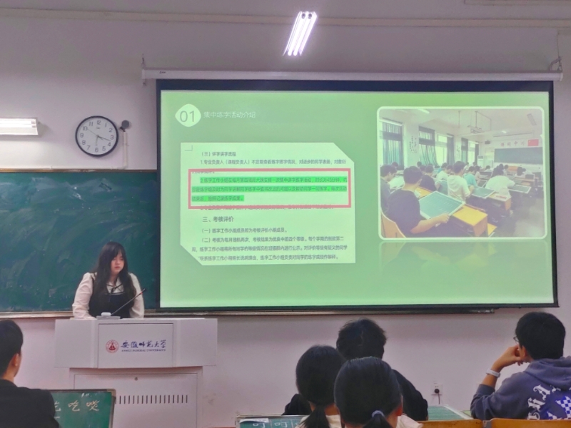 活动伊始,21级练字工作组组长何禹天从评字讲字流程、考核评价方式两个方面具体介绍集中练字活动。然后,她重点说明四点相关事项:第一,请假涉及到考勤问题,会在折合分数时相应减分;第二,集中练字时遇到问题,可以举手请练字组成员帮助;第三,练字组会不定时为同学们分享粉笔字书写技巧;第四,集中练字作为一项实践活动,旨在通过现场指导帮助同学们改善粉笔字书写。之后,她分享了书写规范美观的粉笔字,以期为同学们接下来的粉笔字练习提供示范引领作用。