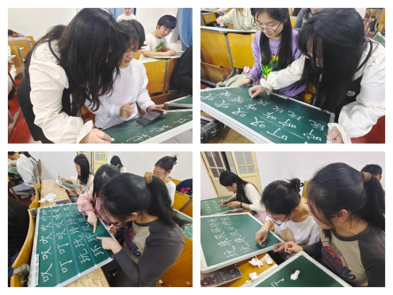 在练习环节中,练字工作组成员对当天需要书写的内容进行大致说明。同学们将练字组讲解的方法技巧应用于自己的书写练习中。同时,练字工作组成员不断巡视查看,对黑板字书写掌握不足的同学提供针对性指导。邬一鸣对陈玉洁同学“环”字的书写提供完善建议并介绍王字旁汉字的书写要领。何禹天在韩曼婷同学的黑板上示范了“瑰”字的书写。在练习过程中,同学之间、练字工作组成员与同学之间交流练习心得,分享书写经验,收获颇丰。