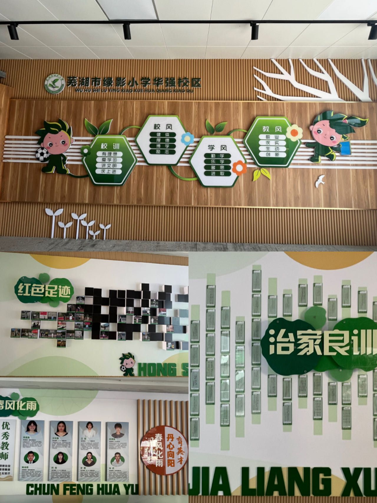 在韦开平董事长的带领下,同学们进行了校园文化参观。韦董事长介绍,绿影小学始建于上个世纪四十年代,原名为“广福小学”,1996年改名为向阳小学,集团坚持以“绿色教育”理念为指导,建设“阳光、恬静、典雅”校园,构建一支“有才气、有底气、成大器”的教师队伍,培养“儒雅自信,乐学多思”的阳光少年。同学们参观了公司的心理咨询室,感受到公司对小员工压力排解与心理健康的关注和重视;认识了公司的两位吉祥物:绿儿——足球少年,体现对体育锻炼的重视;颖儿——读书少女,象征对文化知识的追求;观摩了治家良训角,感受家校合作的教育魅力。
