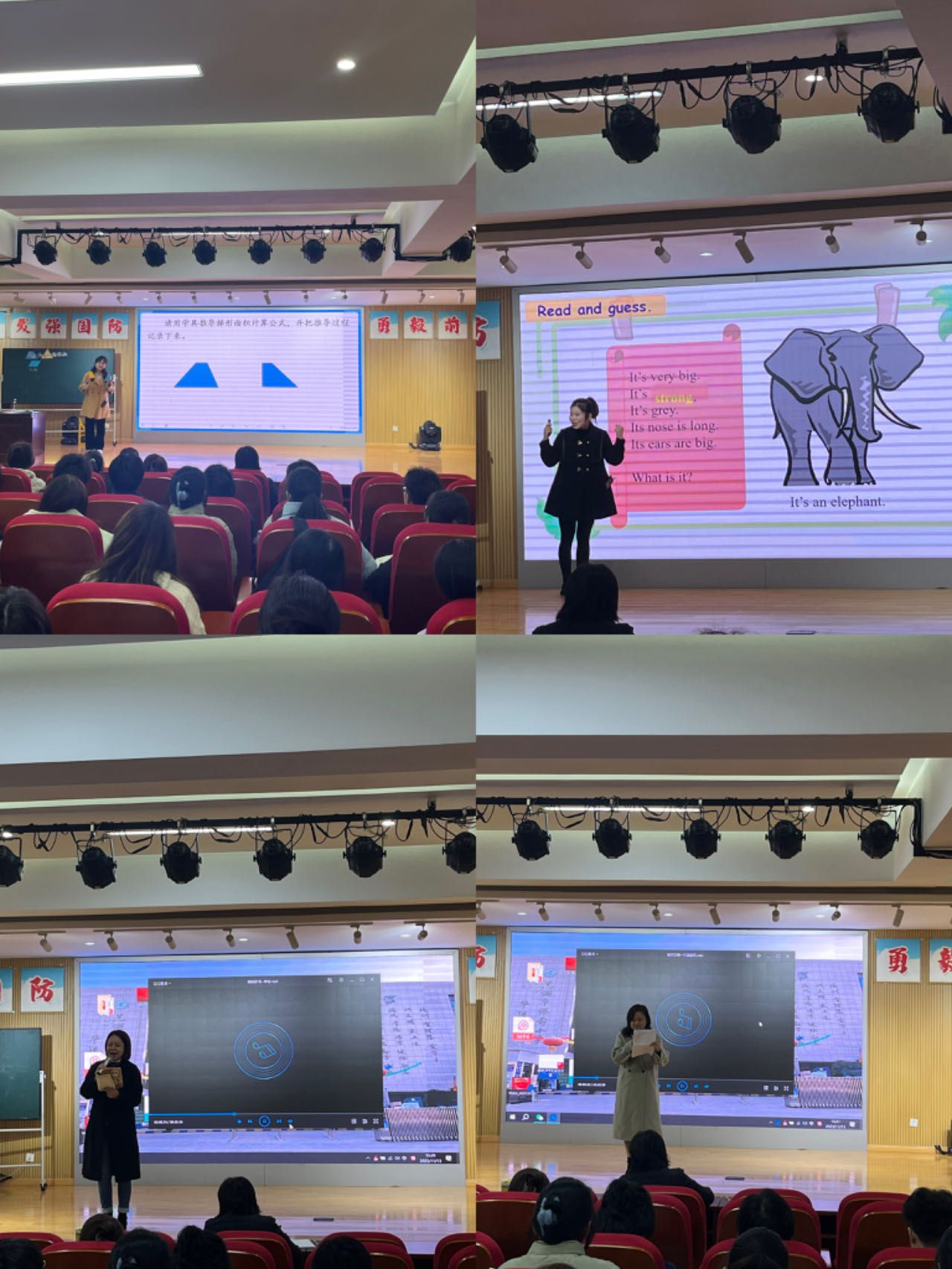 下午,在报告厅,同学们首先观摩学习了数学与英语两位青年教师的无生上课。数学由周旭老师教授“梯形与三角形的面积”内容,教学过程流畅,教学内容前后勾连,板书设计巧妙;英语由孙伟老师教授“Animals in the room”内容,发音准确,举止得体,重难点突出。接着,同学们聆听了“小语好声音”——语文学科特色展示,三位语文老师分别朗诵了《秋天的雨》、《搭船的鸟》和《尾巴他有一只猫》,不仅字音准确、情感饱满,语言更是生动活泼,充满童真童趣。作为师范生,同学们是国家教育事业的后备军,肩负教书育人的使命和立德树人的重任,讲好普通话、写好粉笔字、上好每堂课,这些都是同学们需要锤炼的专业技能。