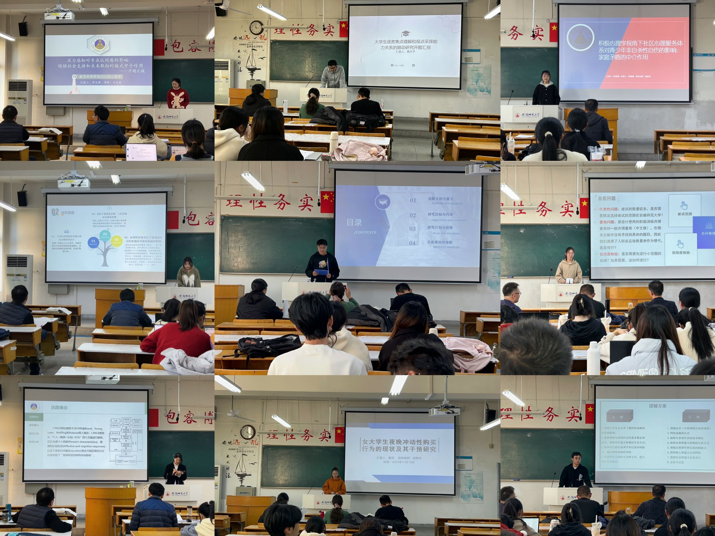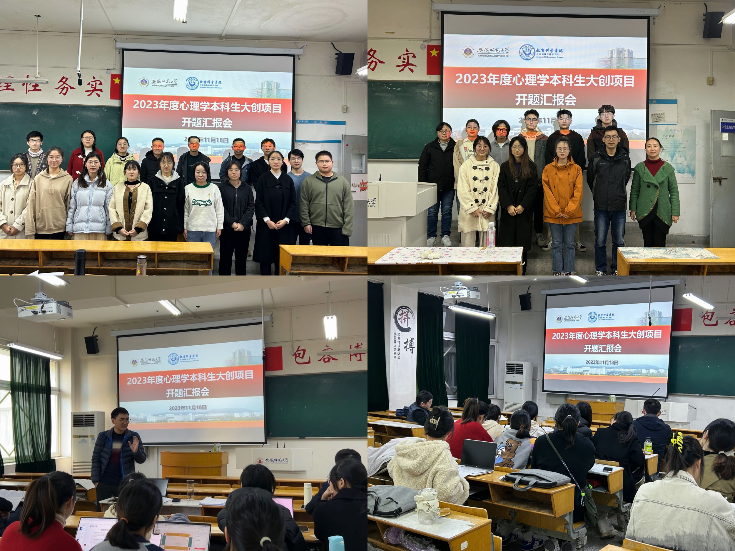 老员工创新创业训练计划项目是培养适应创新型国家建设需要的高水平创新人才的一种创业实践活动,对培养员工创新思维、提高员工实践能力有重要意义。为了帮助2021级心理学参与获批大创项目的同学更好地完成课题,心理学专业于2023年11月18日下午开展了2023年度大创项目开题答辩会。答辩分成三组,担任本次开题答辩会的指导教师有韩建涛、全莉娟、王礼军、孙文强、舒首立、彭苏浩、刘田田、万振东、金剑等专业老师,2021级心理学专业大创项目立项员工全员参与。
