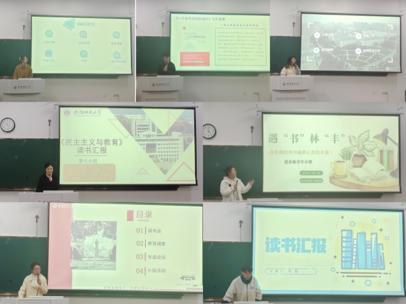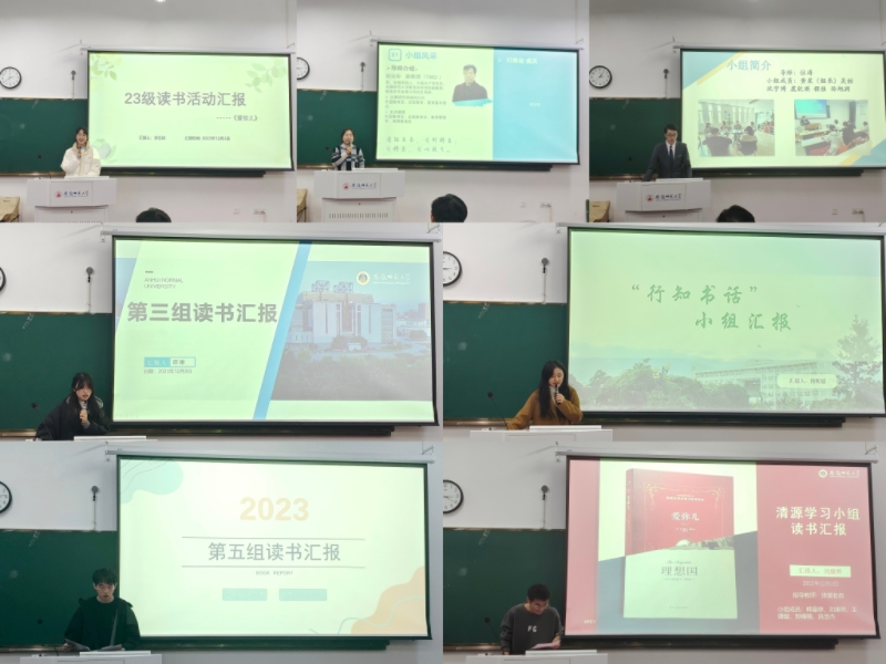 第八组是柳丽娜老师指导的“七窍玲珑”小组,汇报人刘彤彤从小组介绍、读书活动、教育调查、专业论坛、大创、其他活动六个角度进行分享。第九组是江珊老师指导的“edu植物园”小组,汇报人欧阳康杰展示了小组成员介绍、所读书目概况、思考感悟以及活动总结。第十组是吴支奎老师指导的“阅来阅好”小组,汇报人黄蓉围绕小组介绍、书籍介绍、读书收获、心得体会四个部分展开介绍。第十一组是陈元龙老师指导的“卧龙”小组,汇报人尹项哲以书籍介绍、内容概况、比较探究为顺序展开汇报。第十二组是阮成武老师指导的“进步新青年”小组,汇报人邬一鸣从小组规划、师生关系、阅读书目以及阅读感悟四个方面进行说明。第十三组是徐赟老师指导的“立达”小组,汇报人乔琳颖从读书会、教育调查、专业论坛、小组活动四个方面展开详细讲解。第十四组是杨俊铨老师指导的“乐知者”小组,汇报人张超向大家介绍了小组组织分工、小组活动、读书会以及导师交流内容。