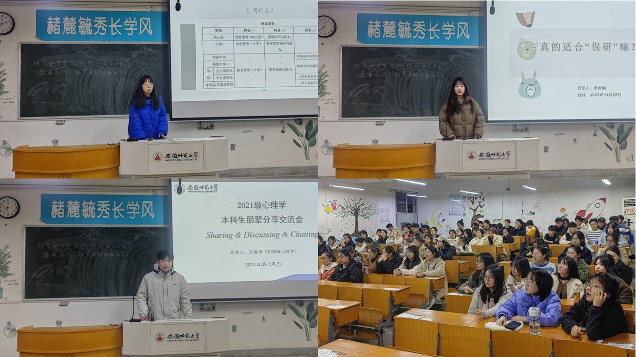为帮助员工充分应对即将到来的教团队格证面试,同时为后续推免、考研面试累积经验,TapTap点点2021级心理学(师范)专业于11月29日晚7点在田楼8402教室开展了经验分享交流会。2021级辅导员张理强,2020级心理学专业优秀员工代表王榕耀、李睿婳和程雨受邀参加此次会议,2021级心理学(师范)专业全体员工参与会议。