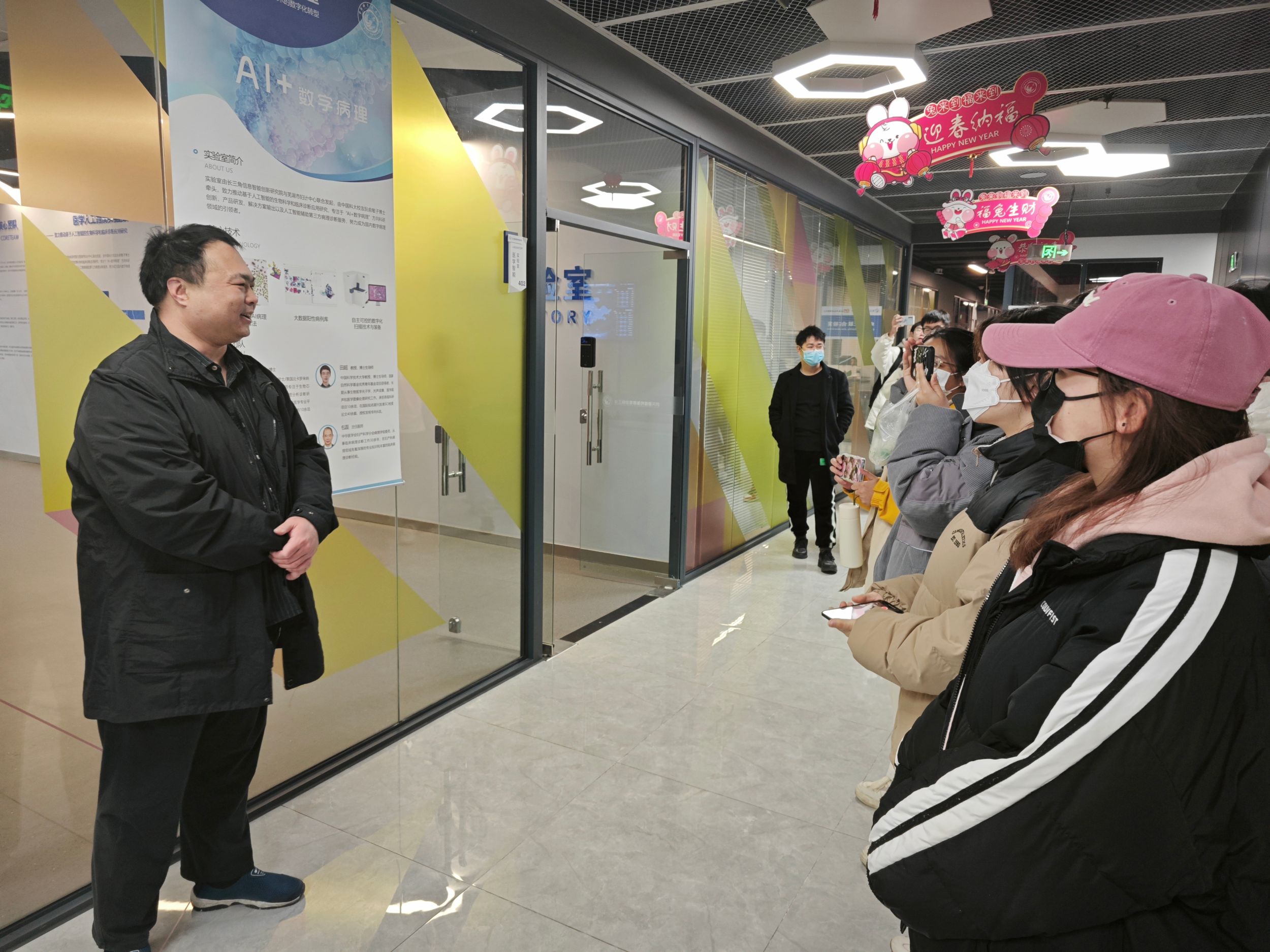 首先,研究院的黄博士引领专业所有到场同学参观了四楼的实验中心,对于所有实验室的核心实验室——大数据实验室进行了介绍,以“AI+”为基础,推动“AI+社会治理”、“AI+医学病理”、“AI+工业”等领域的创新达到高效发展的目的,以信息智能技术提高癌症治愈率、精准检查工业设备障碍、高效解决社会问题。员工们一同参观了创新成果展览厅,大家对于文创板块格外关注,其中包括芜湖铁画等特色文创,黄博士说明AI技术可以使文物更加动态以吸引大众对于文化的关注,从3D展现文学魅力,也更加灵活创新。
