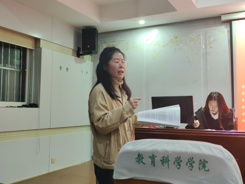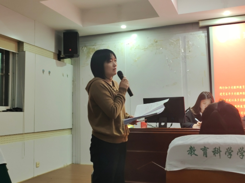 第四位汇报人汪文明按照《新时代乡村教师教育情怀的生成机制及培育路径 ——基于 2023 年全国最美教师董艳的个案研究》的主题,采用扎根理论的三级编码,深入剖析最美教师董艳的个案事迹,进而探讨促进乡村教师教育情怀生成与培育的可行路径。第五位汇报人王颜以《非公费师范生乡村从教意愿影响因素研究 ——基于 A 地方师范院校的调查》为题,利用抽样调查和跟踪访谈的方法,探究地方师范院校的非公费师范生的“乡村从教意愿”,进而阐明提高非公费师范生乡村从教意愿的具体策略。第六位汇报人吴荣鑫依据《论智能时代乡村小学教师专业发展:困境与突围》的主题,针对乡村教师专业发展的现存困境,提出借助互联网途径和信息化手段,助力乡村教师专业能力的提升,并论述乡村教师突破现实困境的具体对策。