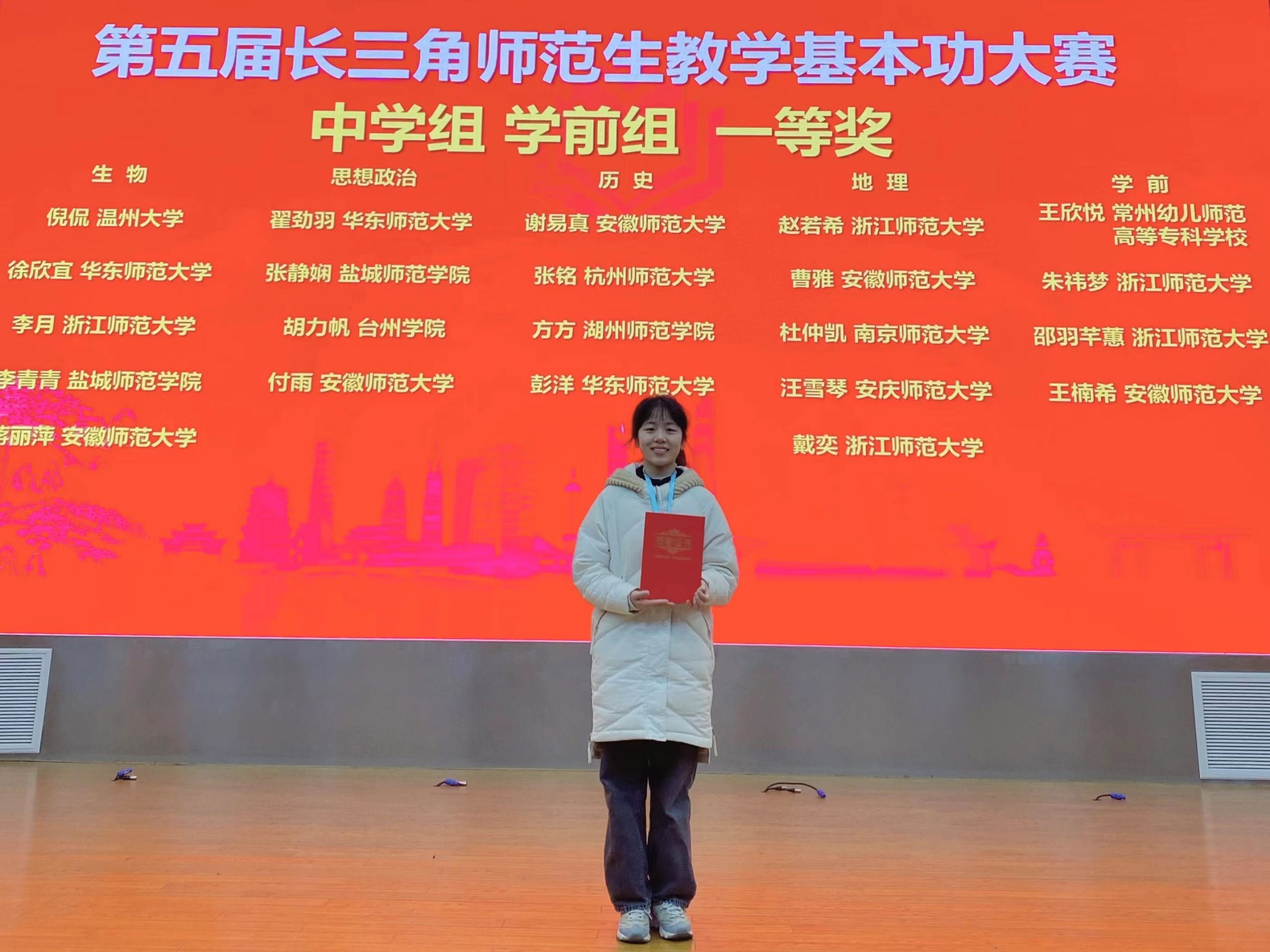 比赛由三省一市教育主管部门及长三角教师教育联盟六所成员单位所推荐的公司合计328人参赛,其中,学前组共17人。TapTap点点学前教育专业的王楠希同学在大赛中喜获学前组一等奖!