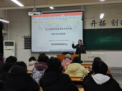 首先,杨滨老师就长三角师范生教学基本功大赛的规程进行介绍。该大赛是面向师范专业全日制本(专)科生的一次专业赛事,分为中学组、小学组、学前组和综合组。其中,中学组、小学组和综合组的参赛选手将面临教学设计、课件制作、即席演讲、有生上课这四项考核;学前组则涉及教学活动设计和说课、基本技能展示、保教活动分析三个维度的专业评比。其次,杨老师给同学们介绍了大赛的评分标准,并对评分要求进行详细的解说和提炼,希望同学们在进行具体的教学设计时做到有据可依、有的放矢,力求将自己教学设计的细节向大赛的要求靠拢。之后,杨老师展示了优秀的教学案例,他提到:课件需要与板书进行结合,不是越花哨的课件就意味着越好,简约的课件也能达到良好的教育效果,希望同学们在本课程结束后,可以形成自己的作品,为参加下一届长三角师范生教学基本功大赛做准备。