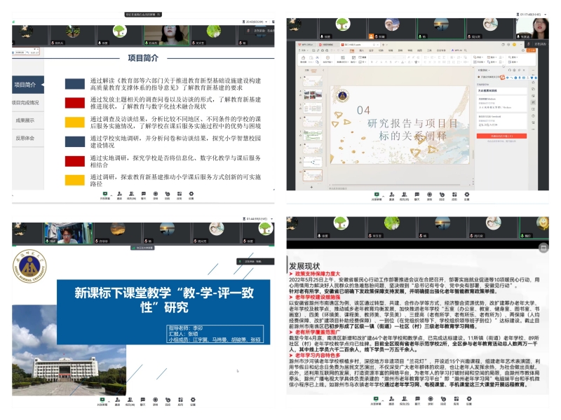 汇报正式开始前,徐赟说明了大创项目完成结题所需达到的各项要求以及本次答辩的整体流程。本次答辩会共有8个项目小组参加,其中5项国家级老员工创新创业训练计划项目立项、4个省级老员工创新创业计划项目立项,实现了大创项目“人人参与,全员覆盖”的目标。项目选题丰富多样,涉及老年智慧教育、小学课后服务、乡村教团队源配置、思想政治课程标准、职教集团共享机制、课堂教学“教—学—评一致性”等。现场答辩流程分为PPT陈述、专家提问、员工作答三个环节,项目负责人按照顺序依次汇报大创项目,从项目背景、研究方法、项目成果、不足与展望等多方面进行阐述。评审老师认真听取汇报、严格把关项目质量,对项目的创新性、科学性与可行性提出相关问题,充分肯定取得优秀成果的项目,并有针对性地从项目内容、材料规范等方面提出指导性建议。会议结尾,徐赟对本次答辩汇报出现的问题进行总结,鼓励同学们在最后阶段结合评审老师意见进一步完善修改,争取高质量地完成大创项目。