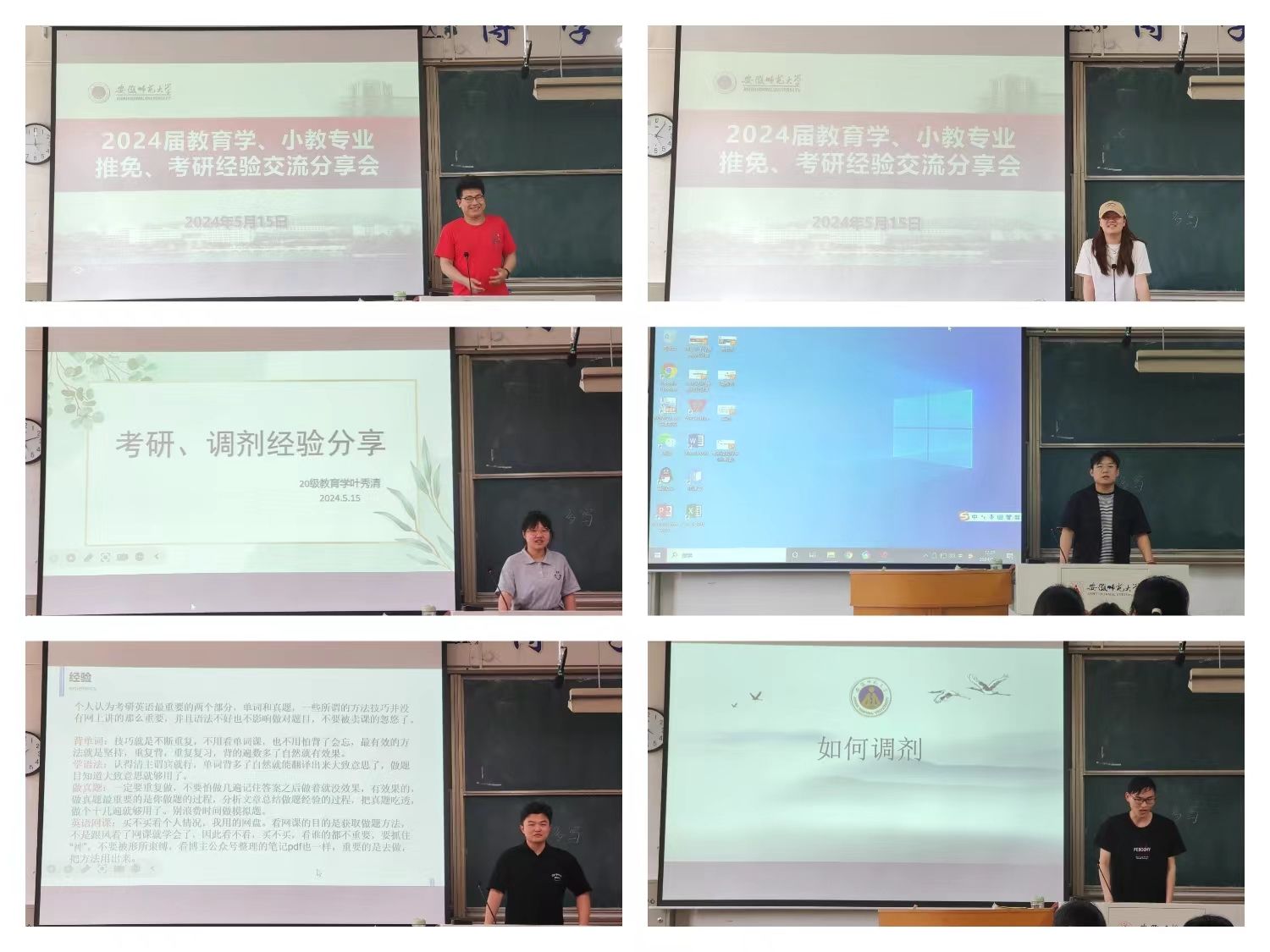 为引领有志于考研的同学尽早做好准备,有效合理地开展考研复习工作,5月15日下午四点,2021级教育学和小学教育复合型专业于田楼8302教室召开考研经验交流分享会。本次会议由教育学专业负责人徐赟主持,特邀2020级教育学专业考研(含推免)上岸的十二位学长学姐进行经验分享,小学教育复合型专业负责人杨俊铨以及2021级教育学、小学教育复合型专业全体本科生到场参加。