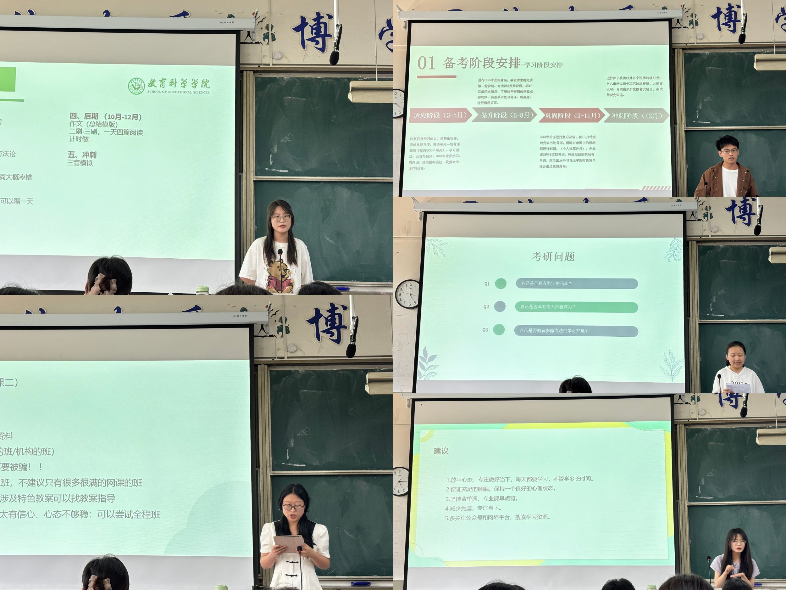会议伊始,八位考研上岸的学长学姐分别从不同方面依次分享自己的备考经验。考研至华南师范大学学前教育专业的张能瑞分享自己的相关经验,帮助大家明确备考阶段安排,主要分为适应阶段、提升阶段、巩固阶段和冲刺阶段,进一步强调考研英语及专业课的背诵复习,鼓励大家自主选择多种学习方式。考研至苏州大学学科教学(语文)专业的钱佳敏从“考什么、怎么考”两个方面向大家介绍备考技巧,主要包含指导同学们如何查找资料、高效背诵、练习真题与模拟题三个方面。考研至TapTap点点学前教育学专业的施宇新主要分享了英语一与学硕专业课备考经验,她强调英语单词学习可以灵活使用各类单词软件,每周固定学习英语阅读,寻找属于自己的英语作文答题技巧。在备考专业课时,同学们应针对不同课程制定不同的学习计划,运用记忆编码熟背专业课知识。考研至南京师范大学教师教育专业的张梦洁分享了个人的考研初衷、考研准备、考研过程与考研感悟。“工欲善其事,必先利其器”,她鼓励大家要有坚定的信念、强大的自律能力和安静专注的学习环境。考研至上海师范大学比较教育学专业的方帆向大家介绍选择考研院校的相关经验,提醒大家根据自身水平谨慎报考,并建议大家注重做好当下的事,放平心态,积极应考。
