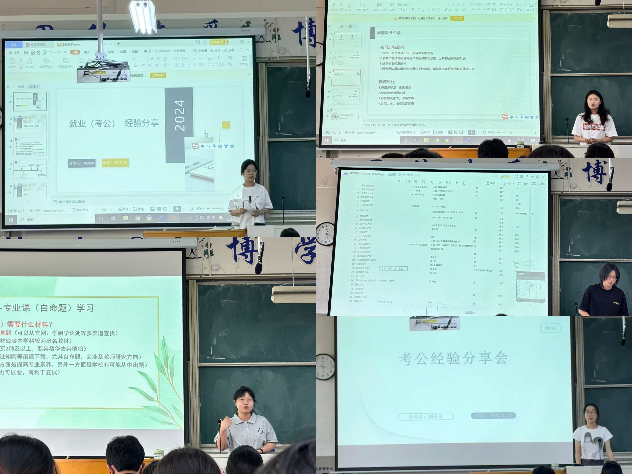 考研经验分享结束后,成功考取选调生的两位学姐也介绍了自己的备考经验。刘玉洁围绕个人基本情况、笔试和面试准备,以及心态调整三方面向大家介绍考公经验,鼓励大家专注眼前事,不过度比较和内耗,劳逸结合,做好时间管理和阶段性调整。宋苏宇着重介绍了备考的时间安排、注意事项等,建议同学们稳心态、重行动,不做夸夸其谈的空谈客、要做起而行之的实干家。最后,由保研至北京师范大学学前教育学专业的徐晶磊、董晶,华东师范大学教育史专业的张海燕,以及华南师范大学学前教育学专业的胡恺,围绕保研流程、保研准备、夏令营情况介绍等方面和同学们展开详细交流。