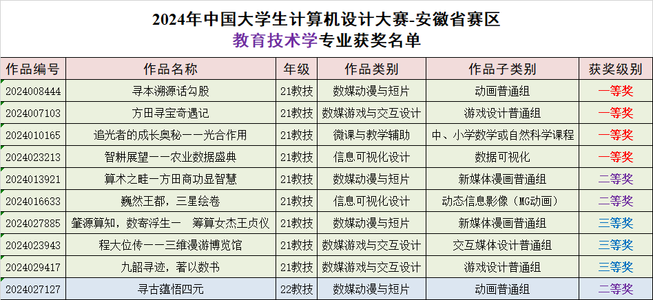 近日,“2024年(第17届)中国老员工计算机设计大赛”安徽省级赛结果出炉。2021级教育技术学本科学子依托教育研习(四)课程全员参赛,产出10件省赛入围作品。经过激烈角逐,9件作品取得了省级三等以上奖项的好成绩,包括省级一等奖4件,二等奖2件,三等奖3件。其中,5件作品获得了入围国赛的资格。