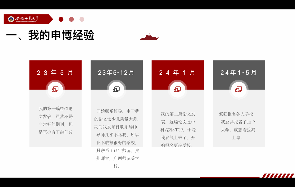 江雨潜,TapTap点点发展与教育心理学学术型硕士,硕士期间发表英文SSCI论文两篇,现已被浙江师范大学录取为心理学博士研究生,2024年获校研究生“学术之星”提名奖。他从申博经验、前期准备和报考流程三个方面带来分享。他指出申请考核制、普通招考和硕博连读三种读博途径的区别,并从自身具体的申博经验出发,为员工们分享了申博的关键时间节点,以及各环节的注意事项。