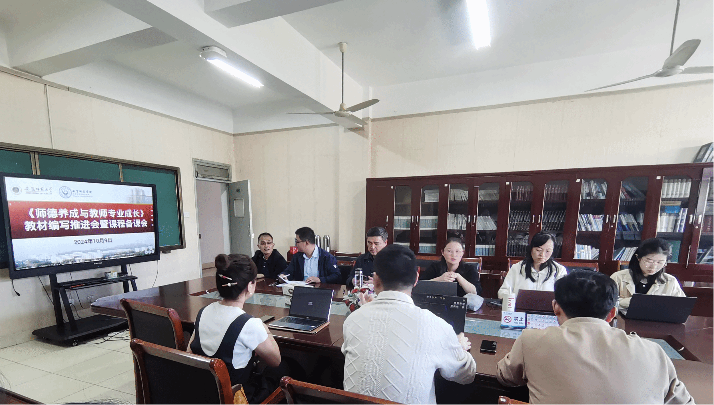 2024年10月9日下午,教师教育课程《师德养成与教师专业成长》教材编写推进会暨备课会在教科楼408会议室召开,与会者有李宜江、杨俊铨、肖龙、位涛、刘婉、金马妮、魏晓敏、苏明明、周元宽等老师与部分研究生助教。研讨会分成上下场,均由课程负责人、教材(共同)主编杨俊铨博士主持。