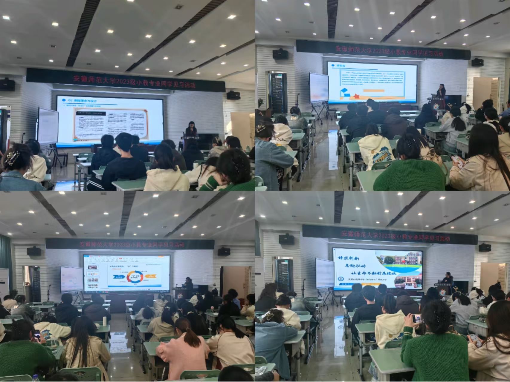 随堂听课结束后,同学们聆听了镜湖小学两位主任的教学特色讲座。第一堂讲座是秦进主任的《镜湖小学“悦成长”课程的实施》。镜湖小学第二课堂“悦成长”课程设置坚持以员工为本,构建多元化课程,并采用融合式教学方法,不断创新评价机制。第二堂讲座是肖敏主任的《科技创新,志趣驱动,让生命不断舒展绽放》。肖敏主任介绍了镜湖小学的“科创教育”特色,镜湖小学以活动促发展,鼓励员工积极参与,以科学、信息科技推动课堂教学新突破,将课后托管与社团课程相结合,共同推动“悦成长”系列课程实施。最后,同学们参观了校园,观摩了员工的大课间活动。