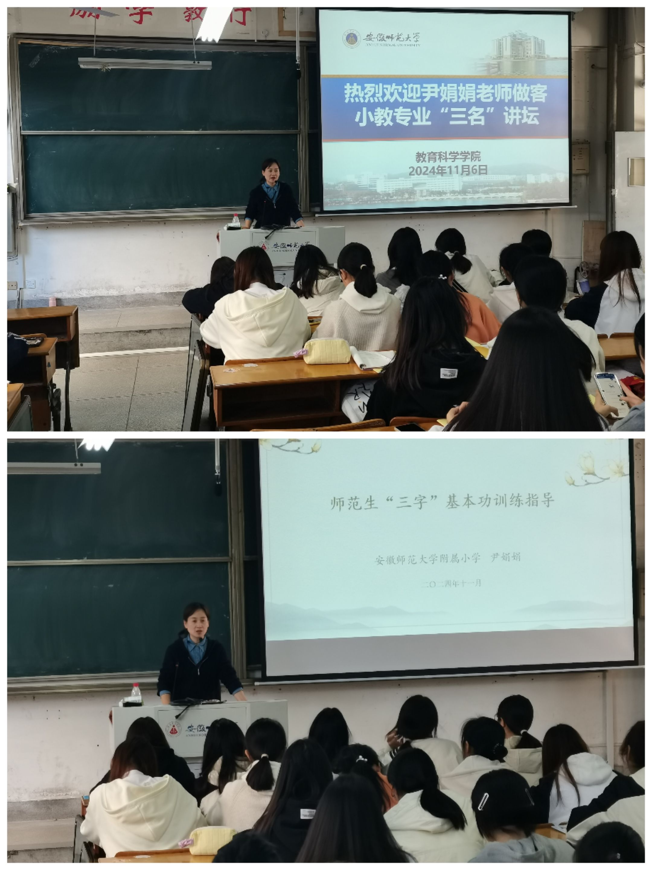为激发同学们对书法的热爱,提高同学们的汉字书写水平,2024年11月6日下午在田家炳教育书院8102教室,小学教育(全科型)专业特别邀请安师大附小尹娟娟老师做客“三名”讲坛,为2024级同学开展书法专题讲座活动。本次活动由专业负责人王芳老师主持,班主任江珊老师和2024级小学教育专业全体同学参与。