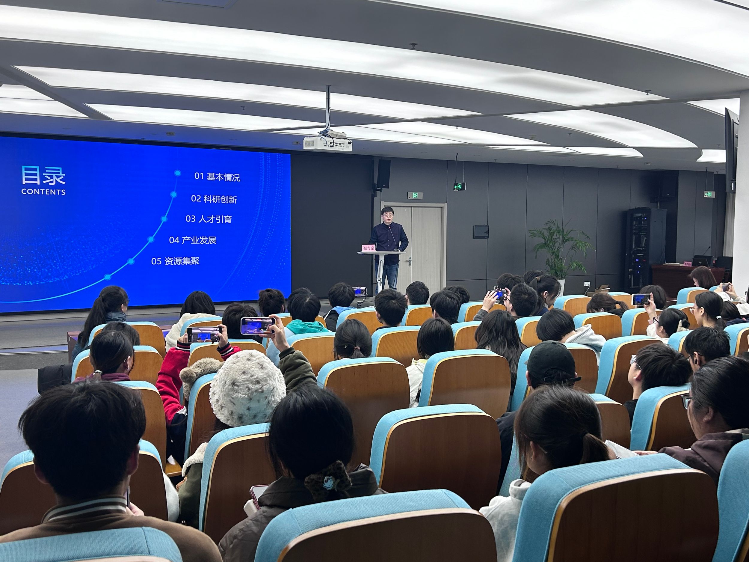 首先,创新研究院产业发展部的张宗谦博士代表研究院对专业师生的到来表示热烈欢迎,并带领专业师生来到二楼会议厅,向师生们阐述了研究院的科研创新、人才引育、产业发展和资源集聚等情况。并对研究院研发工作的科研成果与实际应用场景需求,进行创新性的完善,推广于实际应用中进行了细致地讲解。