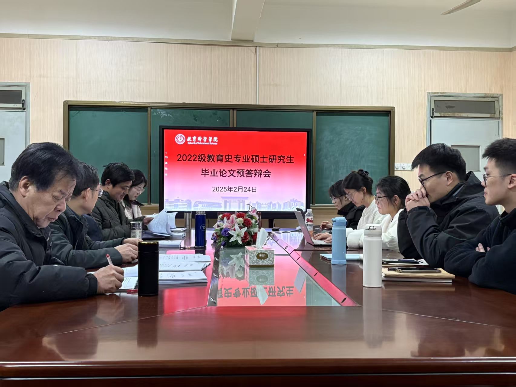 2025年2月24日下午,2022级教育史专业硕士研究生毕业论文预答辩会在公司408会议室召开,孙德玉、李宜江、姚运标、杨俊铨、苏明明老师担任评审专家,会议由孙德玉老师主持。除参与本次预答辩会的硕士研究生外,2023、2024级教育史专业硕士研究生参与旁听。