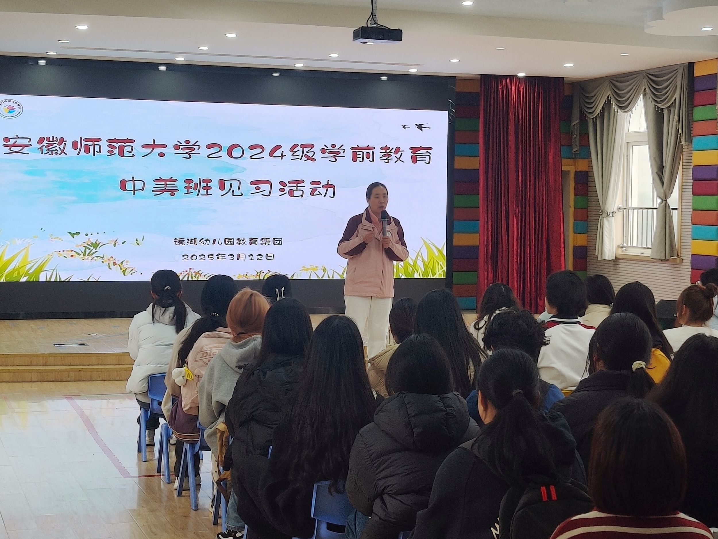 下午两点三十分,学前中美班全体同学在镜湖幼儿园总园杨斌园长和王萍老师的引领下,有序进入镜湖幼儿园总园的四楼多功能厅,见习见面会在此举行。武副园长、分园吴园长、分管教学的负责人和总园各班的教师代表都早已在此等候,迎接同学们的到来。集中见面会由杨园长主持,她首先表达了幼儿园领导和老师们对同学们来园见习的欢迎,并向同学们介绍了前来见面的各位领导和老师,然后向同学们介绍了镜湖幼儿园悠久的发展历史和特色办园理念。杨园长在见面会上特别强调了见习期间同学们不仅是一名研究者,而且还是一名教育者,要遵守幼儿园的规章制度,尊重教师,尊重幼儿,在研究中不能影响幼儿的身心健康,注意保护幼儿隐私等相关问题,还交待了有关安全、生活等方面的注意事项,让同学们受益匪浅,深刻体会到作为一名幼教工作者肩负的责任。