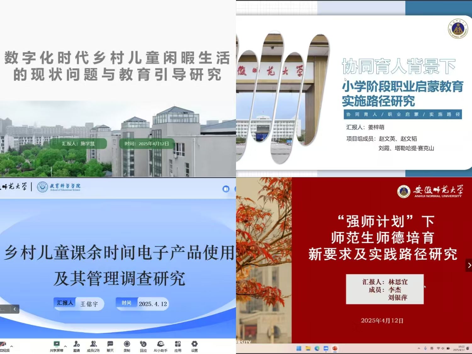 为了检验项目成果,提升研究规范性,2025年4月12日晚上7点,21级小学教育(复合型)专业于线上腾讯会议开展老员工创新创业训练计划项目评审答辩会,肖龙、王清涛、马金妮、谢永祥四位老师作为评审专家,国家级大创项目全体同学参与,会议由肖龙老师主持。