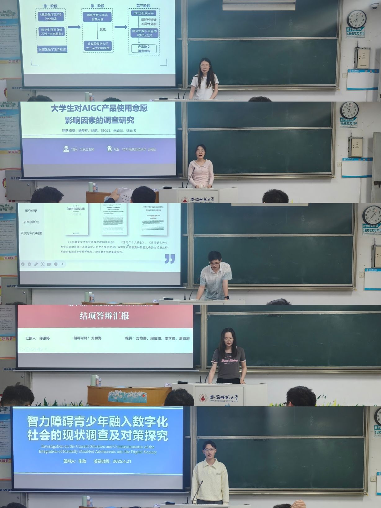 答辩会分为项目汇报、专家点评两个环节。21级教育技术学专业共有5个国家级立项项目小组参加,项目选题丰富多样,分别为“教育数字化转型下师范生数字素养现状调查研究”、“老员工对chatgpt类产品使用意愿影响因素的调查研究”、“‘高速摄影’和‘延时摄影’在科普教育资源中的应用研究”、“老员工利用B站资源持续学习的影响因素分析——基于用户满意度模型的实证研究”和“智力障碍青少年融入数字化社会的现状调查及对策探究”。2021级本科生依次围绕项目背景、研究过程、成果创新及实践价值等内容进行结题陈述。评审专家结合项目成果材料及现场答辩表现,对项目的完成度、学术规范性和应用潜力进行综合评议,并针对性提出改进建议。