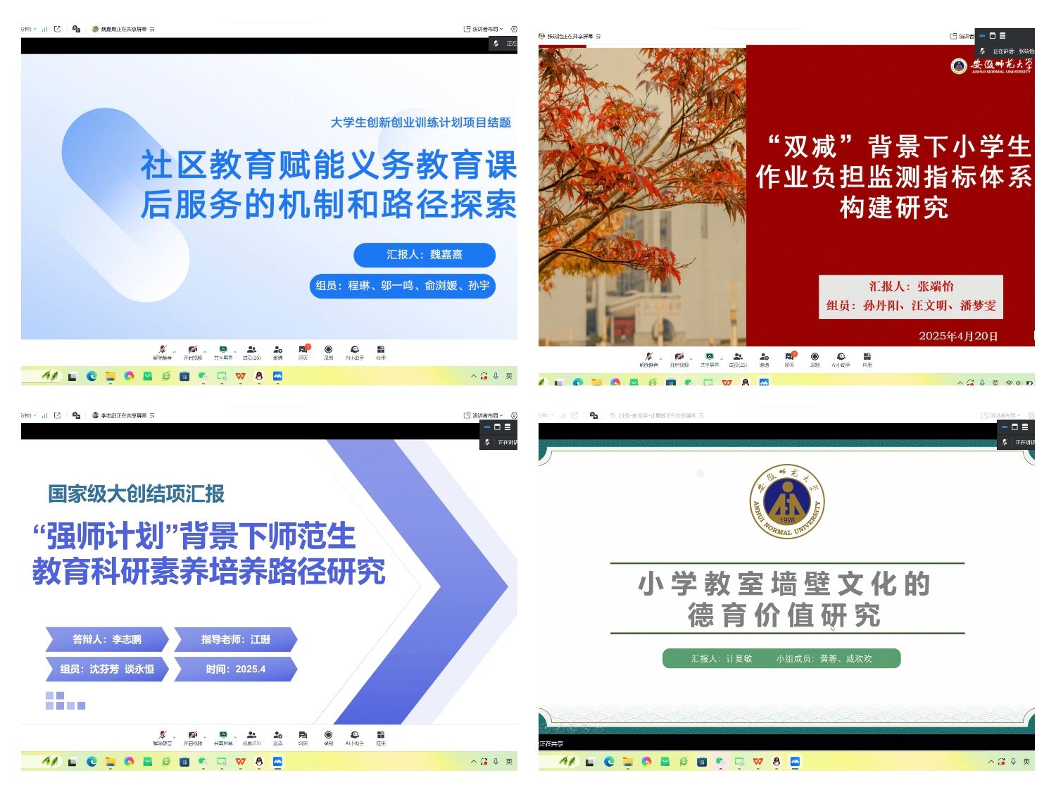 汇报正式开始前,陈娜简要说明了大创项目完成结题所需达到的各项要求以及本次答辩的整体流程。本次答辩会共有4个国家级项目小组参加,项目选题丰富多样,涉及社区教育、师范生素养、教室墙壁文化、作业负担等方面。现场答辩流程分为PPT陈述、专家提问、员工作答三个环节,汇报的四位项目成员分别围绕《社区教育赋能义务教育课后服务的机制和路径探索》《“强师计划”背景下师范生教育科研素养培养路径研究》《小学教室墙壁文化的德育价值研究》《“双减”背景下小员工作业负担监测指标体系构建研究》,从项目背景、研究方法、项目成果、不足与展望等多方面展开汇报。评审老师认真听取汇报、严格把关项目质量,对项目的创新性、科学性与可行性提出相关问题,充分肯定取得优秀成果的项目,并有针对性地从项目内容、材料规范等方面提出指导性建议。会议结尾,陈娜从两个方面对本次答辩汇报会进行总结,一是评审重点主要是项目中运用的研究方法、研究开展过程取得的成果及呈现方式;二是结项要求需要对标文件标准,建议同学们会后整理建议,结合评审老师意见进一步完善修改,争取高质量地完成大创项目。