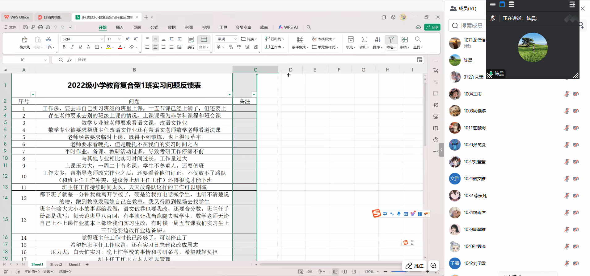 为助力员工高质量完成教育实习任务,明确实习方向与成长路径,2022级小学教育(复合型)专业于2025年4月29日晚上20点在腾讯会议,召开实习线上专业交流会。班级全体同学积极参与,专业负责人陈晨老师针对前期收集的实习问题进行统一解答,并结合实际案例为同学们指明实践方向。