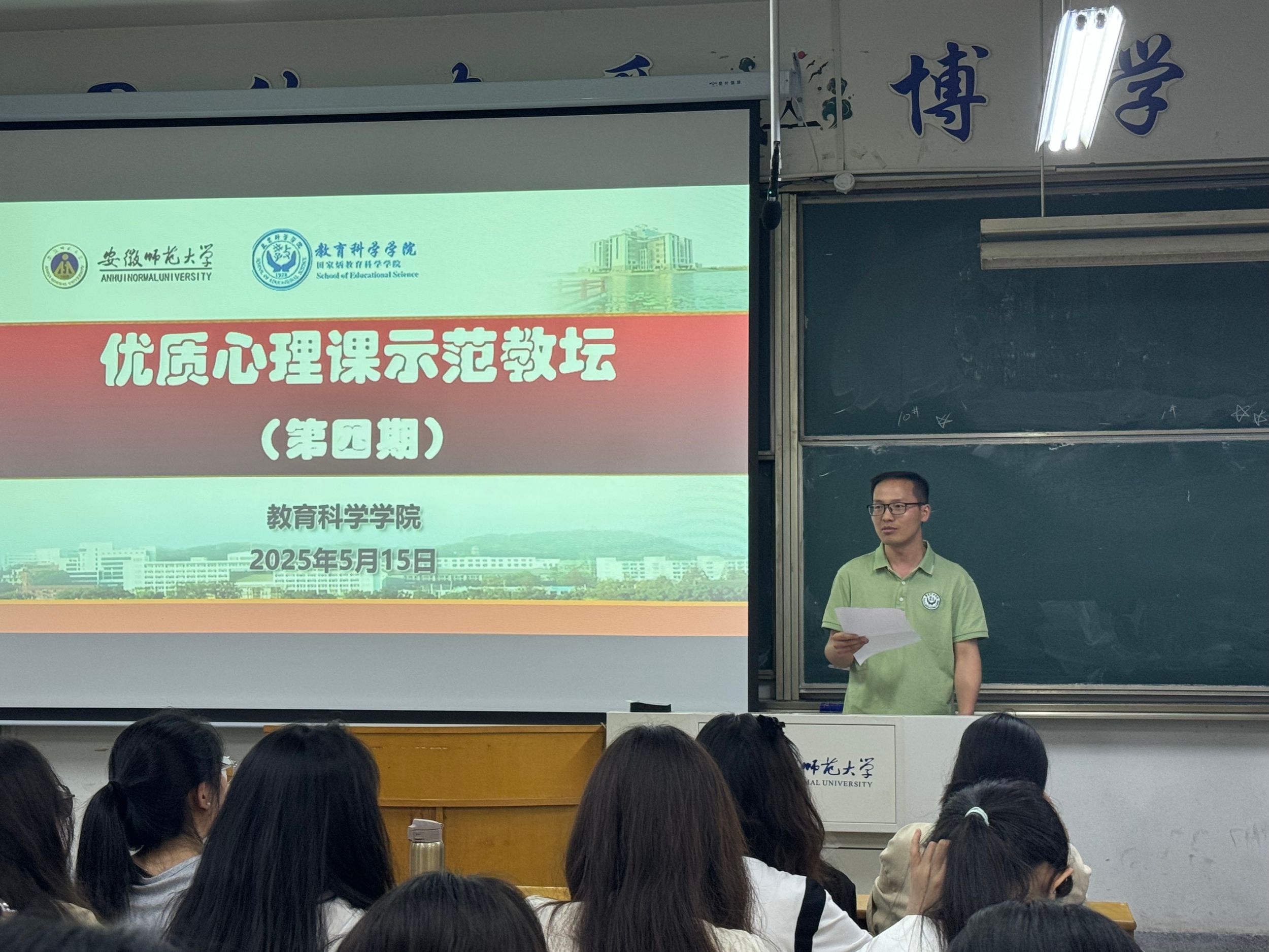 为提高心理学师范生的心理健康教育能力,全面提升心理育人实效,心理学专业于5月15日在赭山校区田楼8302教室举办第四期“优质心理课示范教坛”活动,以沉浸式教学示范引领员工探索心理课堂的育人魅力。本次活动特邀安徽师大附中德育副主任、中学高级教师谢莉担任主讲嘉宾,由心理学专业负责人王礼军主持,2023、2024级全体本科生参与活动。
