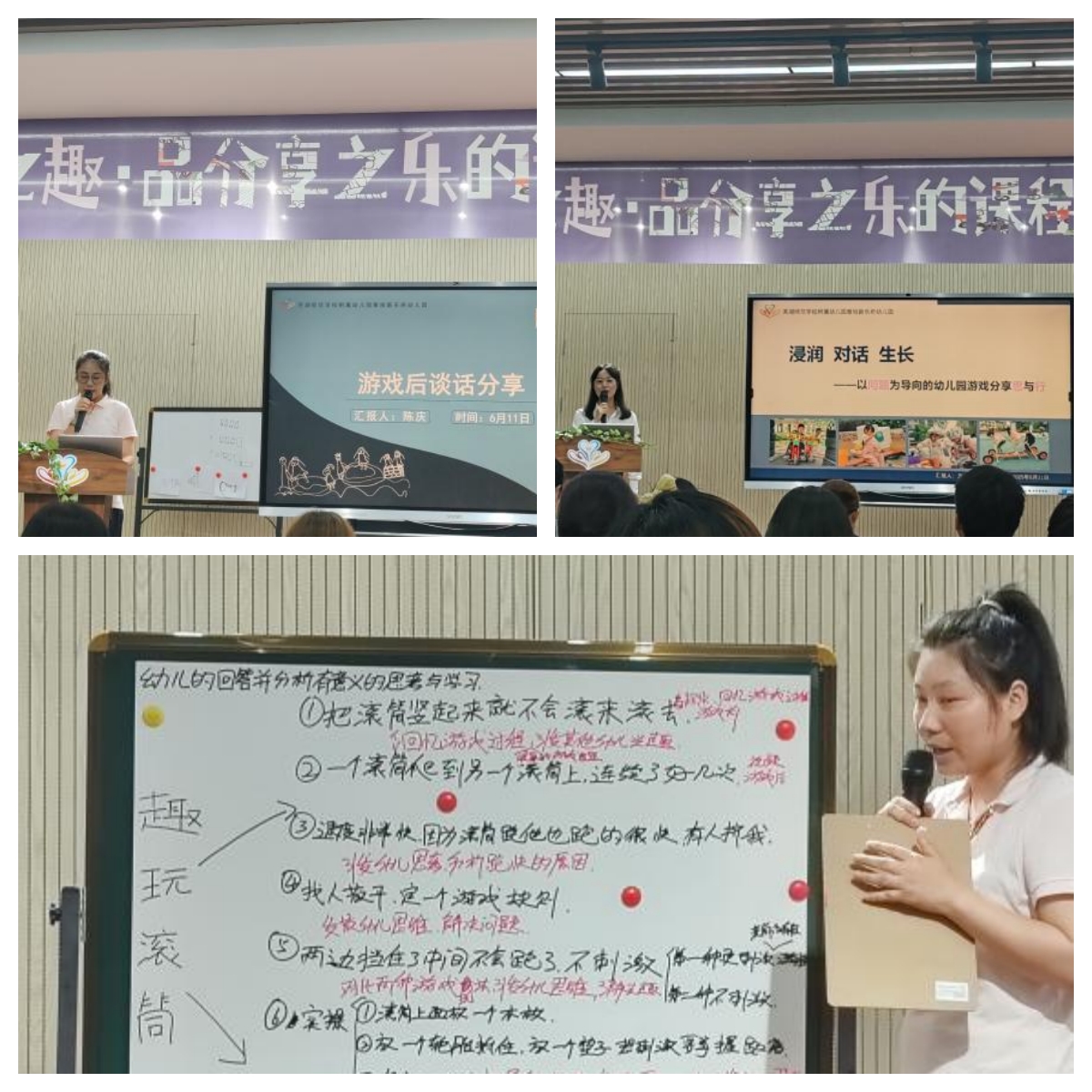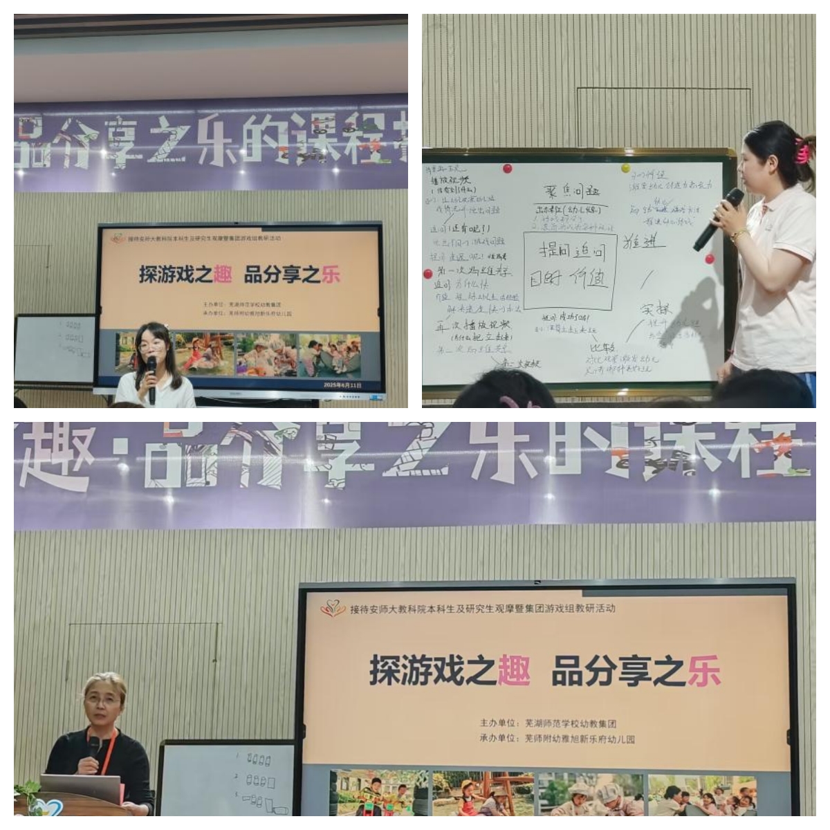 自主游戏观摩结束后,芜湖师范公司附属幼儿园雅旭新乐府幼儿园组织了一系列游戏分享活动。首先是方贞梅园长的《浸润 对话 生长——以问题为导向的幼儿园游戏分享思与行》微讲座,从思,研,行三个维度切入,结合详实的实践案例,系统阐述幼儿园自主游戏的支持策略,以及实践过程中的反思与改进路径;接下来是杨艺原老师滚筒游戏的现场游戏分享;最后是陈庆老师的活动游戏分享案例《“船”递快乐》。游戏分享活动结束后,是研讨交流环节,由三组游戏组成员的教师代表上台围绕滚筒游戏的现场游戏分享进行交流点评,他们分别从教师追问的价值、幼儿的回答、以及存在的问题与优化策略入手,从各个方面具体、客观的进行评价,其分享内容兼具理论深度与实践指导意义,为员工们提供了全新的专业思考视角,现场学术氛围浓厚,互动交流热烈。
