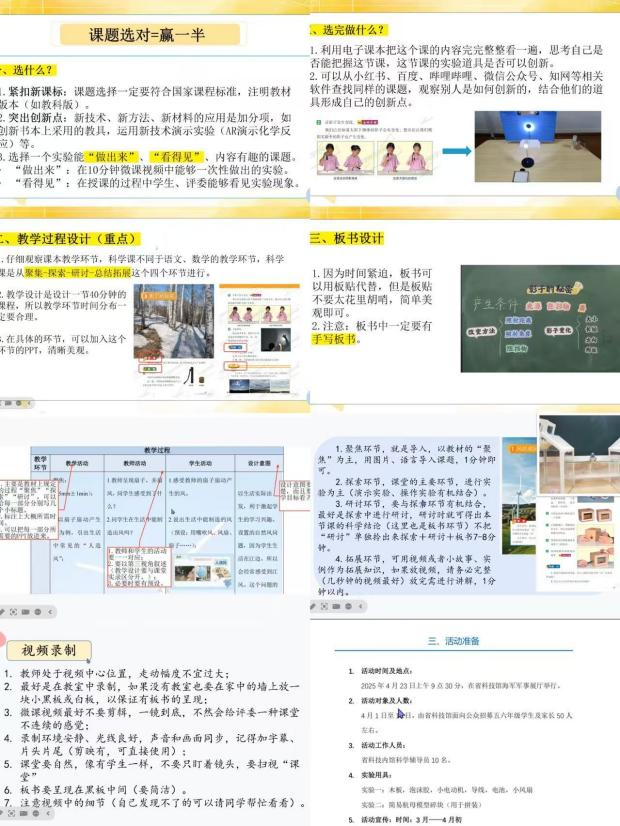 活动第一项,资深引路——学长学姐倾囊相授。2021级余佳遥同学聚焦大赛核心环节,系统分享了成功经验:第一,精准选题:紧扣科学课程标准,突出创新性;建议优先参考教科版教材相关内容,广泛研究历年获奖课题,重点关注3-6年级学段课题方向;选题后需深入观摩优秀案例,积极创新实验器具,凝练独特创新点。第二,教学设计:强调以员工为中心的设计理念,注重探索求证与实验设计的逻辑闭环。第三,展示优化:板书设计简洁居中、PPT制作简约美观。桑瑞瑞同学则重点解析了大赛流程、材料规范与实战策略:第一,赛程与材料:大赛分线上初赛与线下决赛,且选题后不可更改。第二,教学设计核心:科学课须以员工探索为核心,确保实验现象清晰可视。第三,视频录制要点:环境安静、光线充足;教师站位居中,侧身板书确保面部可见;推荐在真实教室环境下一镜到底录制。第四,科技活动方案设计:主题立足课标并融合时政热点(如航空航天),确保实践性与可行性;方案需结构完整(背景、目标、准备、流程、预案),善用AI辅助框架构建,再进行个性化精修。