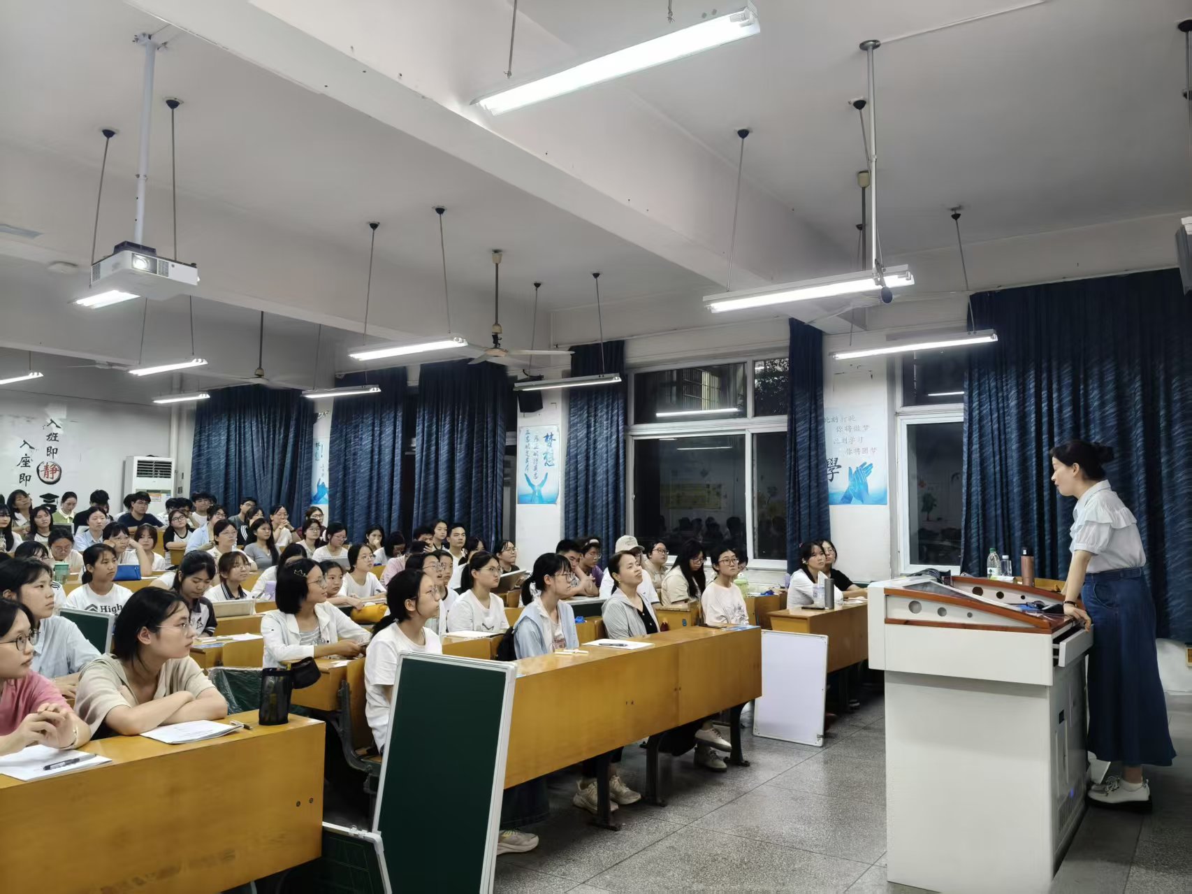 讲座既有书法理论也有现场实操。尹老师让同学们书写《寻隐者不遇》,并请同学上台示范书写粉笔字,尹老师给出专业的建议和评价,将同学们易犯的书写错误和一些易错字的基本笔画一一详细讲解。同学们纷纷表示这样的专题讲座对大学学习、书法练习有很大帮助。