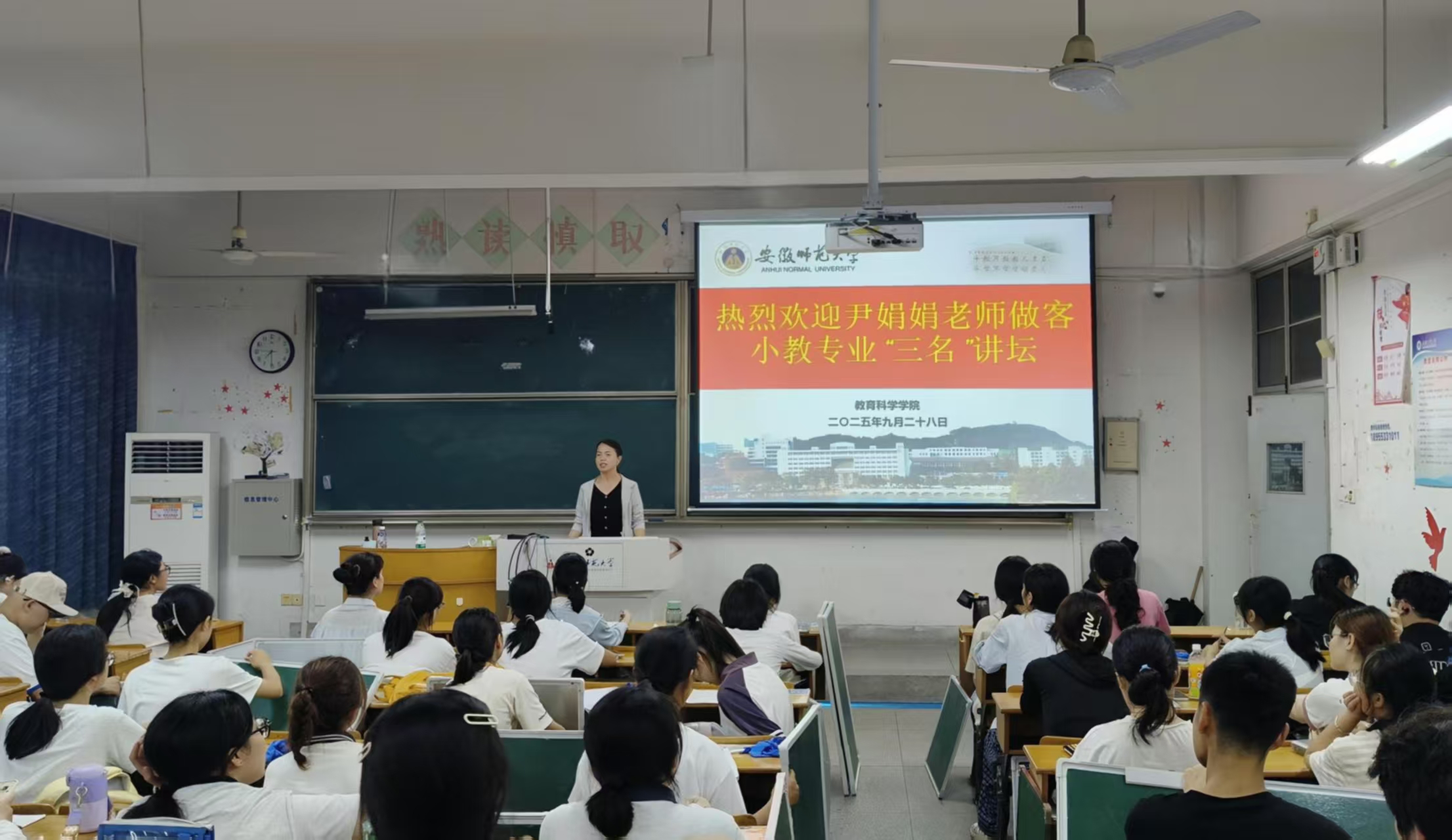 为了帮助同学们掌握书法练习的正确方法,2025年9月28日晚在田楼8103教室,特别邀请公司优秀毕业生尹娟娟老师做客小学教育专业“三名”讲坛,为2025级小学教育和教育学专业全体新生做书法专题讲座——《方正有道,师者为范——师范生硬笔书写特训》。讲座由小学教育(全科型)专业负责人王芳老师主持。