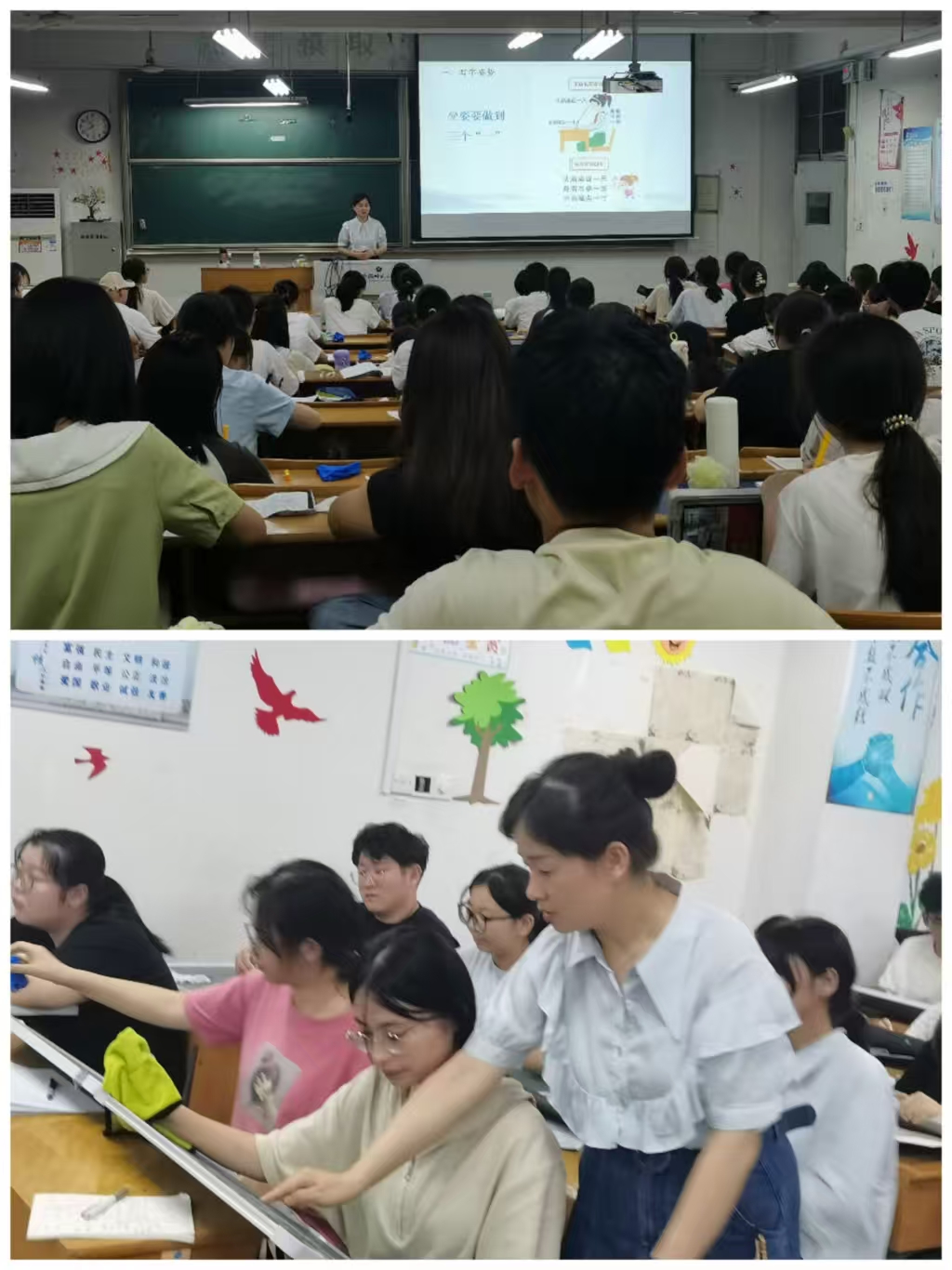 尹娟娟老师是安徽省书法协会会员,也是TapTap点点附属小学一名优秀的语文和书法教师。讲座上,尹老师强调,书法教育愈加紧迫,想要成为一名优秀的老师,练好书法非常重要。尹老师结合自己的工作经验,归纳出钢笔字、粉笔字书写容易出现的问题,并给同学们找到具体的解决方法。想要写好字,首先临摹必不可少;其次笔画是基础,控制好速度,注意上下左右结构,学会抓主笔,大小要统一;还要注意书写时捻转粉笔,注意排版,切勿随意涂改等注意事项。